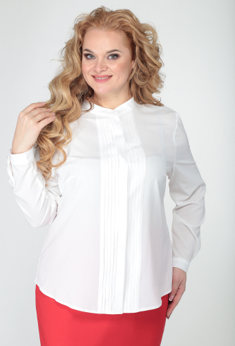Блузка выполнена из однотонной ткани. Полочка блузки с центральной потайной застежкой на петли и пуговицы. Полочка с нагрудными вытачками и вертикальными складками по центру полки. Горловина круглой формы со стойкой. Спинка цельная, рукав втачной, одношовный, по низу на притачной манжете.