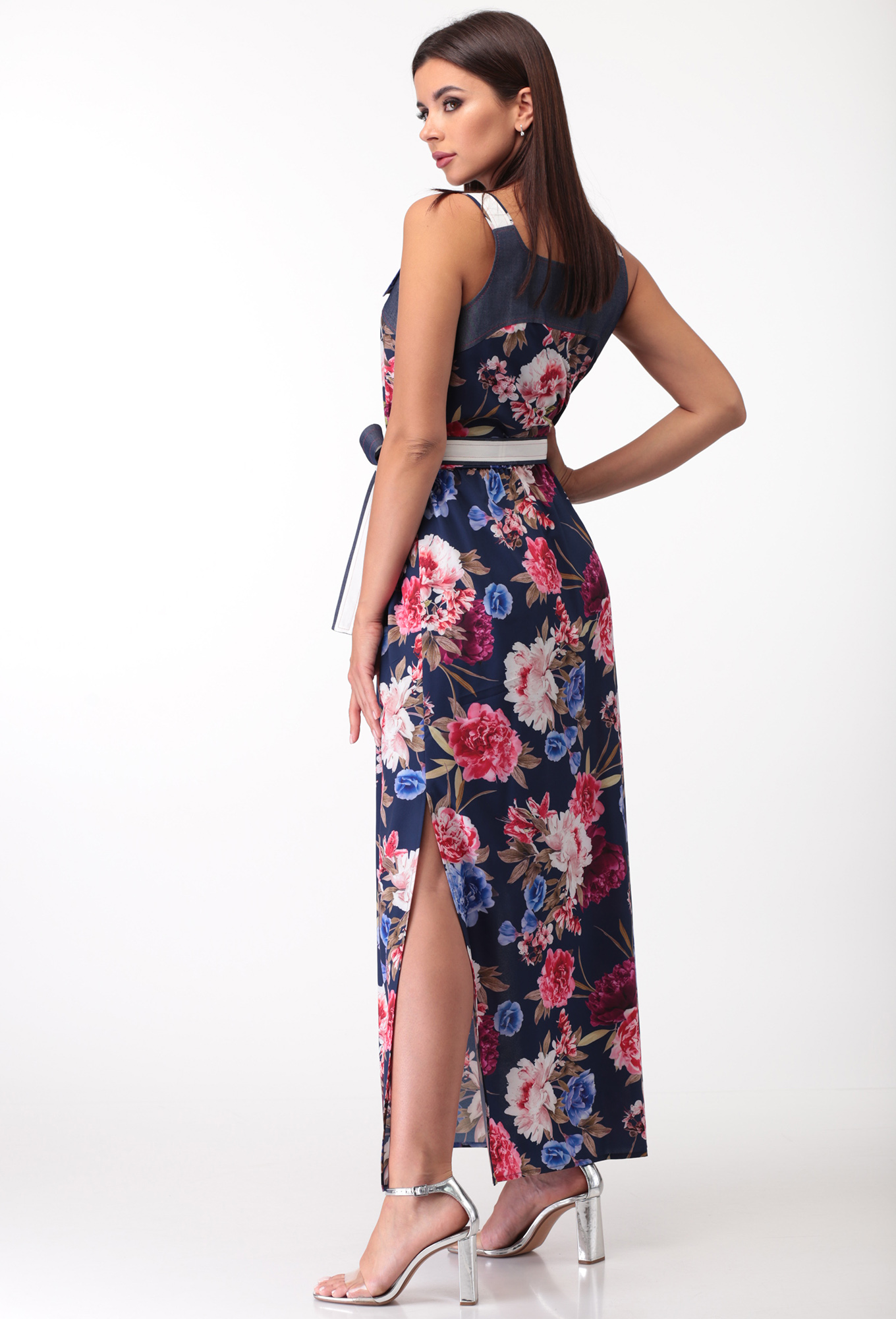 Платье выполнено из ткани с набивным рисунком, в качестве отделки - однотонная ткань типа "джинс". Платье прямого силуэта, отрезное по линии талии. Приталивание достигается за счет съемного пояса и эластичной тесьмы по линии талии. Платье с открытыми плечами, на бретелях. Бретели с пряжками и возможностью их регулирования. Полочка лифа с центральной застежкой на петли и пуговицы. Юбка платья длинная, прямая, со сборкой на эластичную тесьму по линии талии и разрезами по боковым швам. На бретели и съемный пояс с одной стороны настрочена декоративная тесьма.