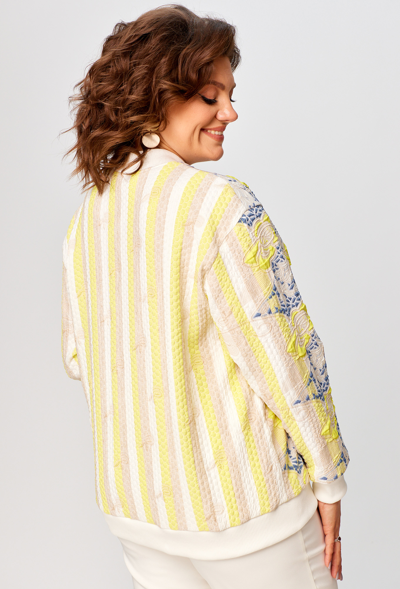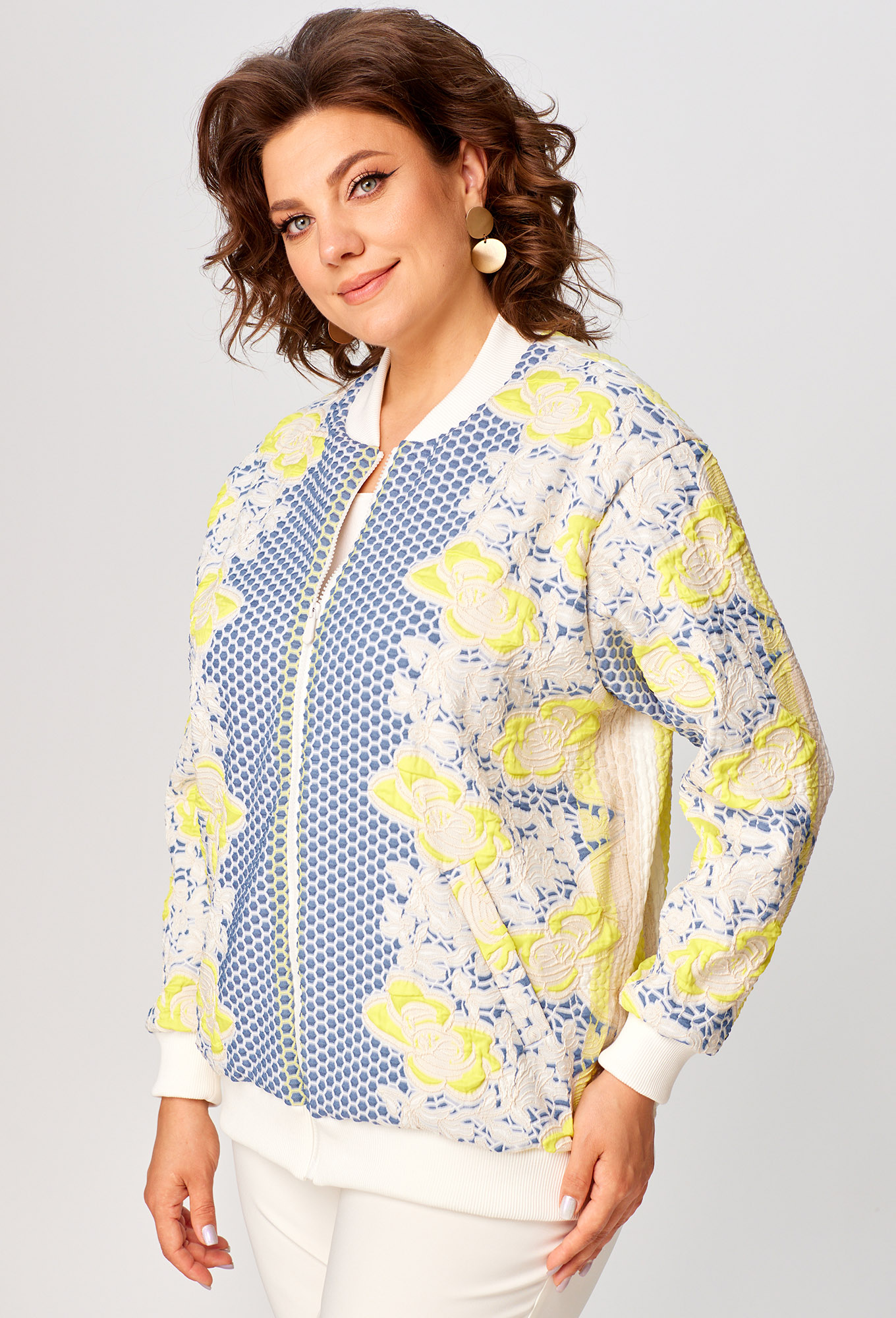 Жакет (бомбер) прямого силуэта. Полочка с центральной застежкой на молнию, отрезной плечевой кокеткой и карманами с листочками.