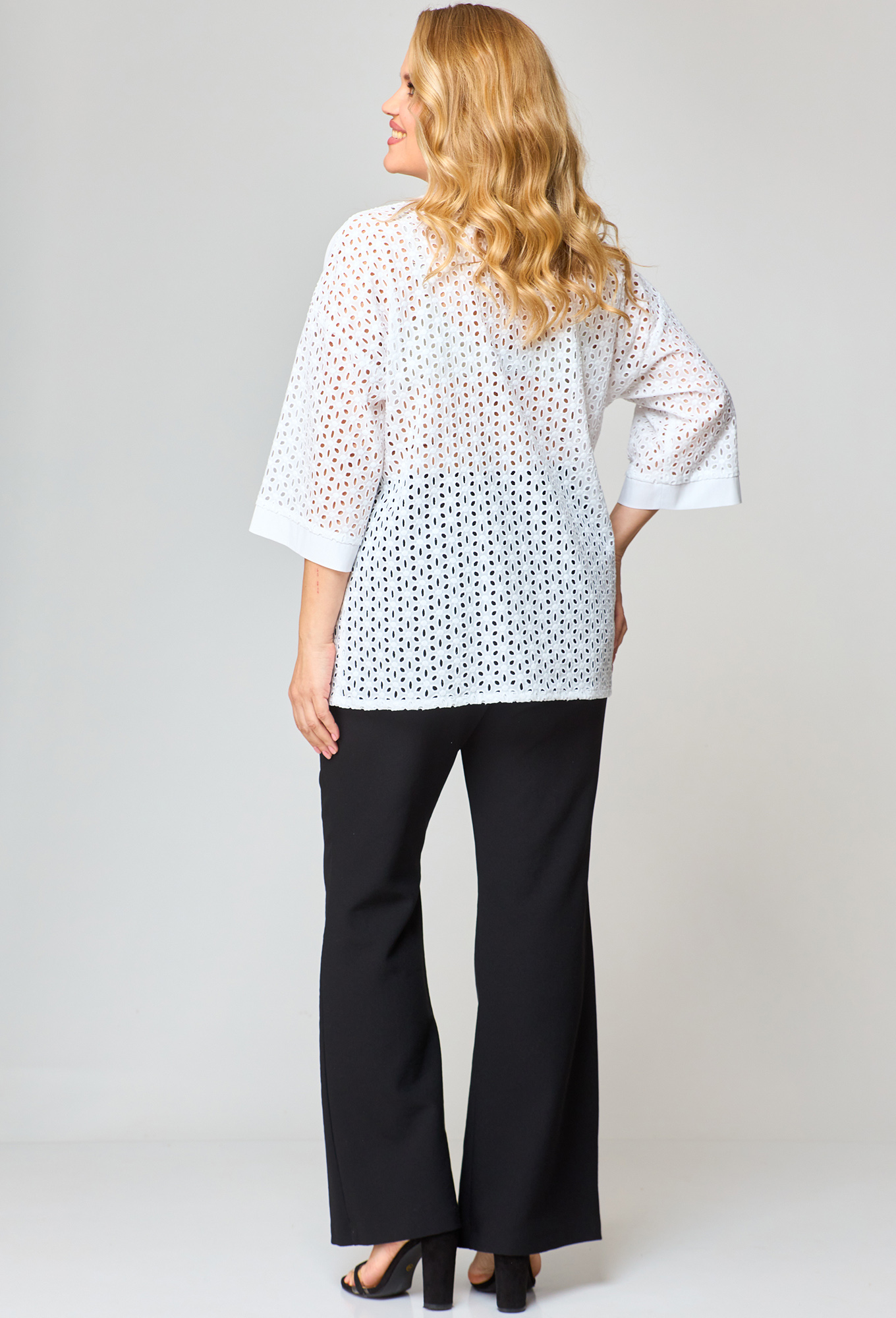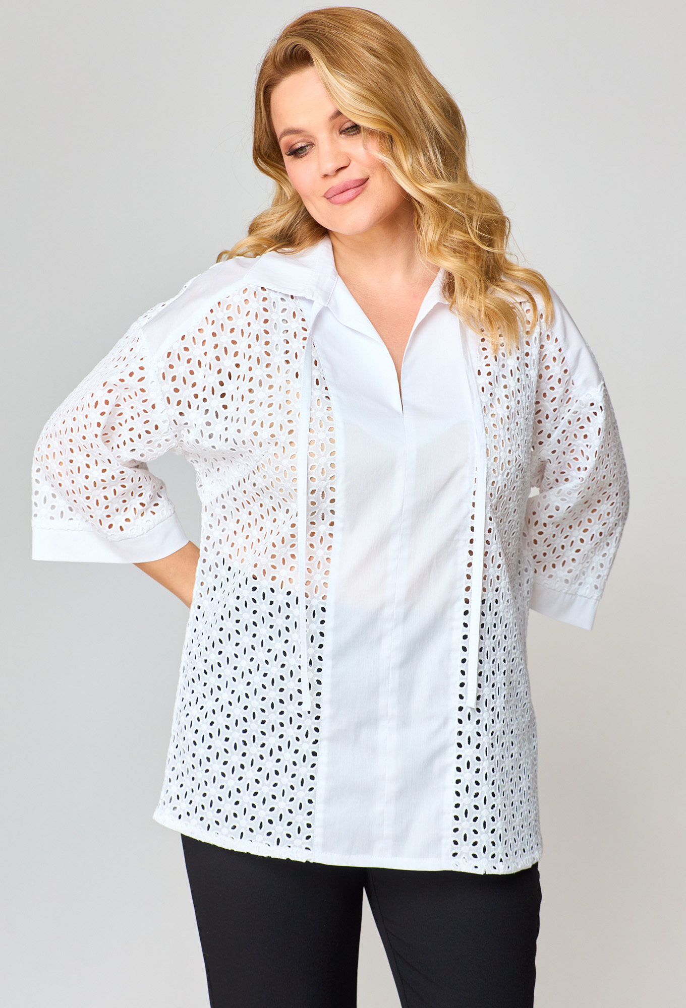 Блузка прямого силуэта, выполнена из ткани “решелье”, в качестве отделки использована гладкая ткань. Полочка блузки с нагрудными вытачками, отрезной плечевой кокеткой и центральной вертикальной вставкой из гладкой ткани. В верхней части среднего шва полочки обработан разрез. Горловина обработана притачным воротником рубашечного типа, на стойке, с завязками. Пройма углубленной формы со спущенной линией плеча. Рукав рубашечного типа, длиной 3\4, одношовный, по низу на притачной манжете из гладкой ткани.Прямой силуэт, свободный крой (не оверсайз и не облегающий) — такой рубашке всегда найдётся применение.