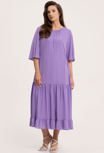 Полочка лифа платья с вертикальными рельефами выходящими из пройм, горловина круглой формы. Передняя часть юбки платья с талиевыми вытачками. Между лифом и юбкой полочки обработана планка из сетки. Спинка со средним швом и талиевыми вытачками. В верхней части среднего шва спинки обработана потайная молния, в нижней части разрез.