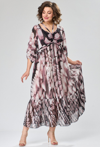 Платье свободного силуэта, длиной макси, выполнено из ткани из шифона с набивным рисунком. Платье с отрезным лифом. Полочка лифа двухслойная, нижняя часть с нагрудными вытачками и фигурным подрезом. Верхняя часть с кулисой по центру, через которую продеты шнуры. Спинка лифа с талиевыми вытачками. Рукав формы реглан, одношовный, длиной за локоть. По низу рукав на резинке. Юбка платья со сборкой по шву притачивания к лифу и притачным воланом со сборкой по низу юбки.