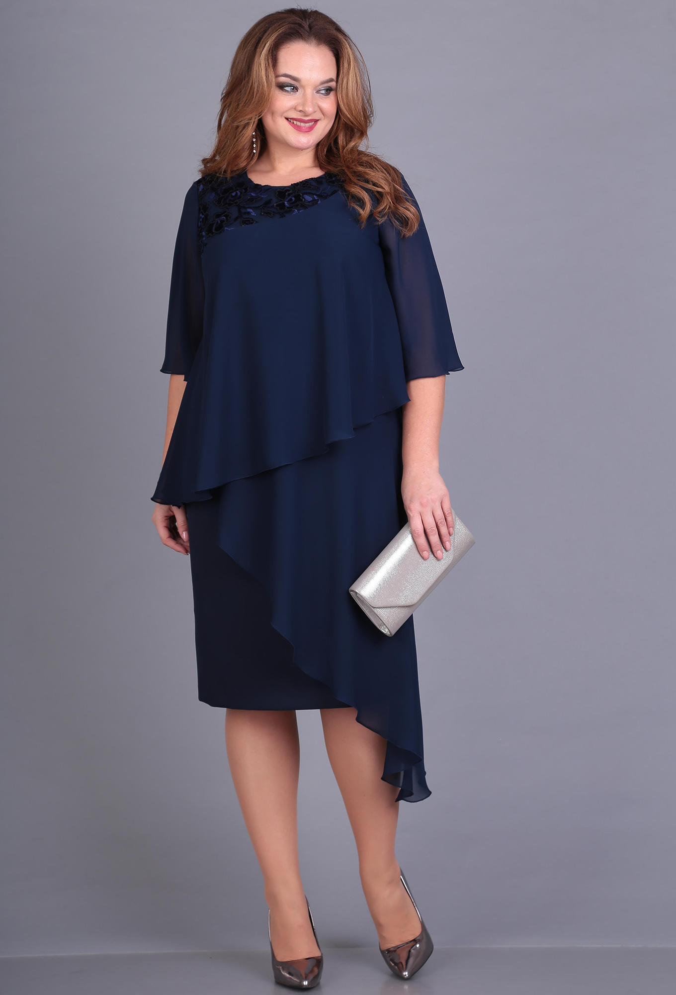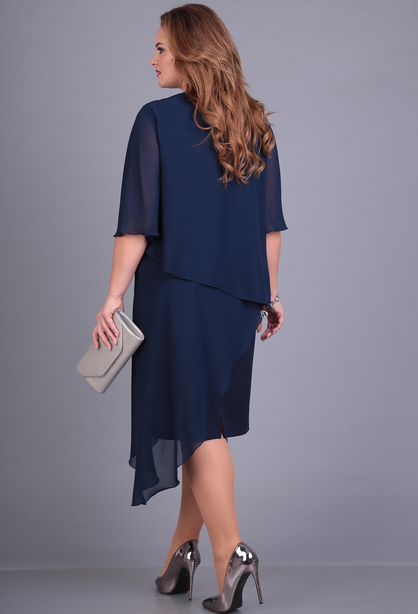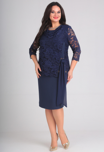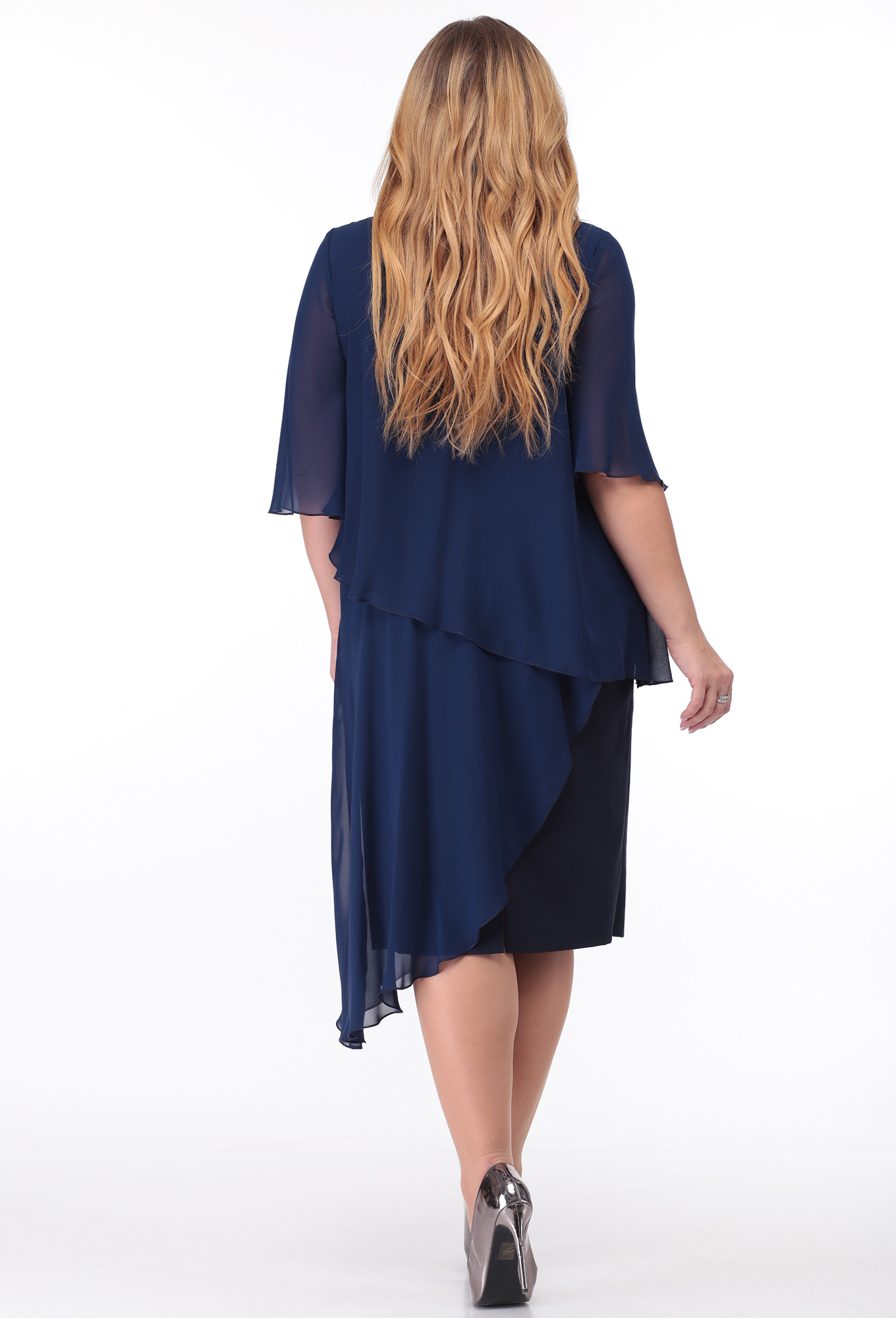 Платье длиной чуть ниже колена, двухслойное. Платье выполнено из трикотажного однотонного полотна, однотонного шифона и элементов гипюра (вышивка на сектке). Верхняя часть платья двухслойная, лиф-основа с нагрудными вытачками, выходящими от шва притачивания к юбке. Отрезная фигурная асимметричная кокетка в верхней части полочки с наложением гипюра на трикотажное полотно. Рукав втачной, одношовный, слегка ниже линии локтя. Горловина круглой формы. Нижняя часть платья - юбка, притачная, двухслойная. Передняя часть юбки-основы с талиевыми вытачками, задняя часть юбки-основы также с талиевыми вытачками и средним швом, в нижней части которого обработан разрез. Верхняя часть юбки асимметричной формы, выполнена из шифона. Потайная молния обработана в левом боковом шве.
