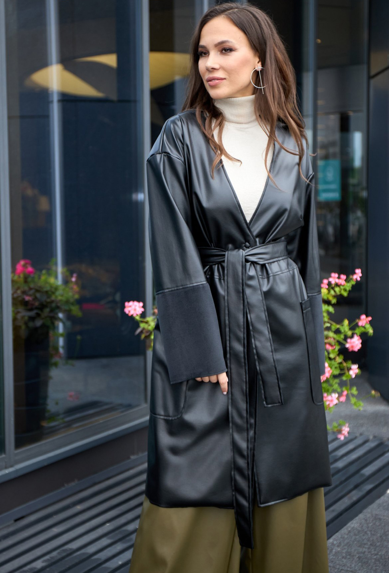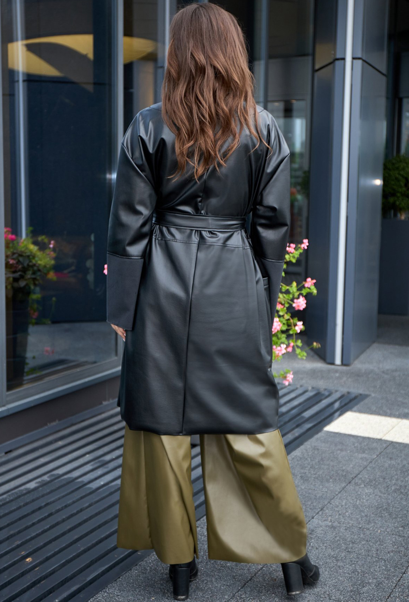 Пальто выполнено из искусственной кожи. В качестве отделки использована искусственная замша, прямого силуэта, длинной до колена. Полочка пальто с центральной застежкой на кнопки, вертикальными рельефами и прорезными карманами. Горловина V-образной формы. По линии талии полочки горизонтальный шов. По боковым швам в области талии настрочены шлевки, через которые продет пояс. Спинка со средним швом. Пройма углубленной формы, рукав рубашечного типа, одношовный с отрезной широкой нижней частью из отделки.