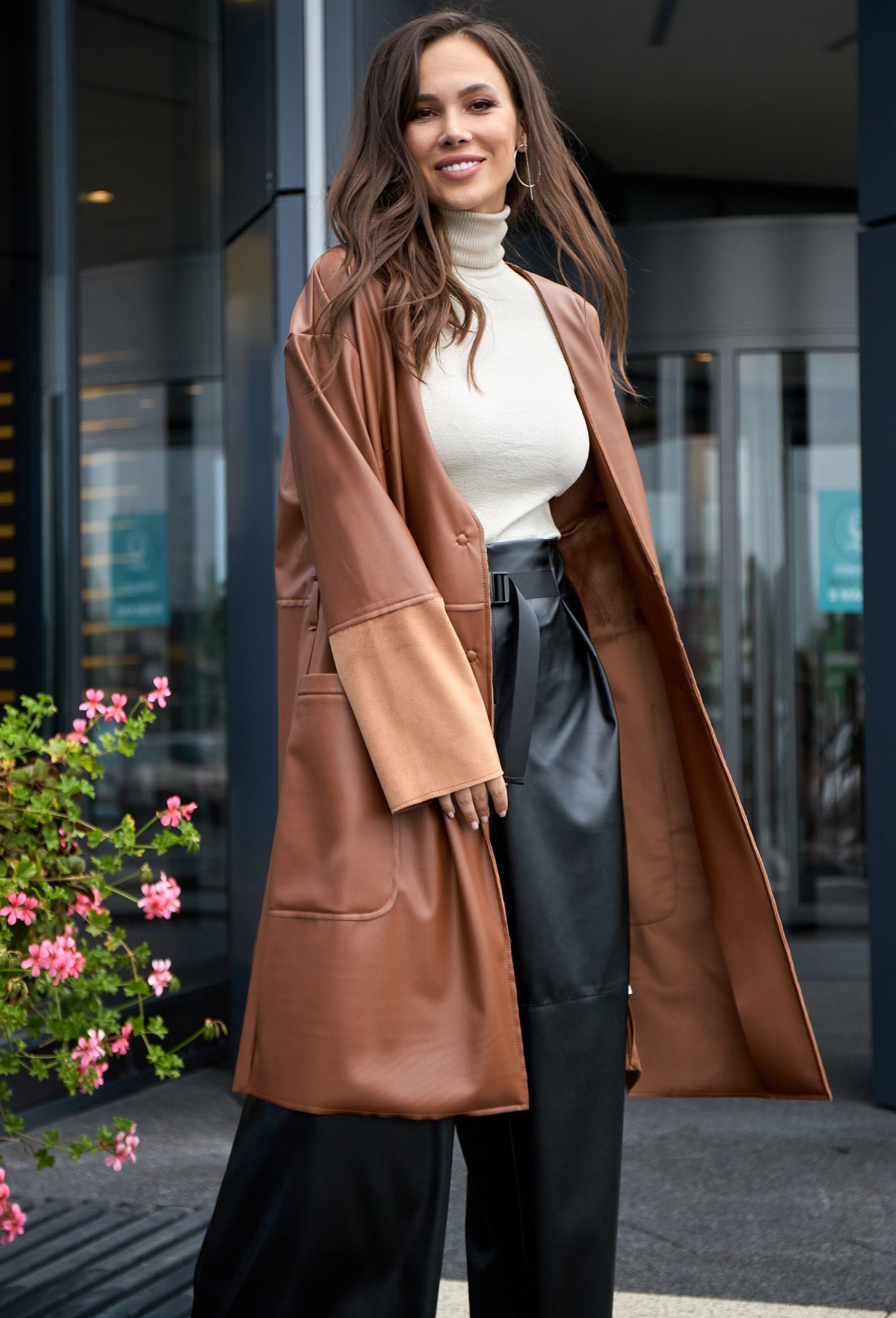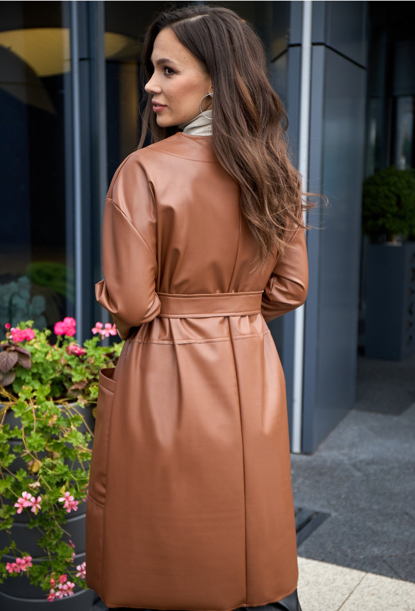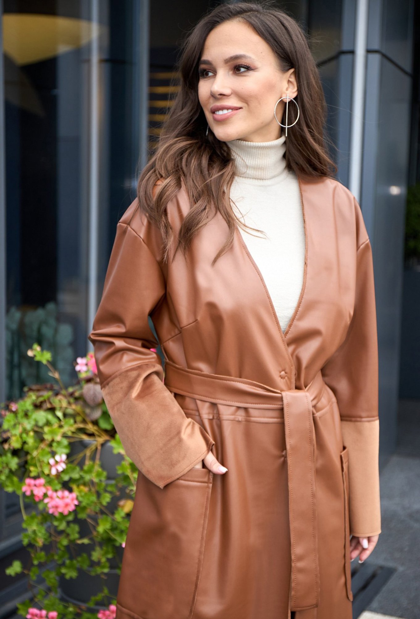 Пальто выполнено из искусственной кожи. В качестве отделки использована искусственная замша, прямого силуэта, длинной до колена. Полочка пальто с центральной застежкой на кнопки, вертикальными рельефами и прорезными карманами. Горловина V-образной формы. По линии талии полочки горизонтальный шов. По боковым швам в области талии настрочены шлевки, через которые продет пояс. Спинка со средним швом. Пройма углубленной формы, рукав рубашечного типа, одношовный с отрезной широкой нижней частью из отделки.