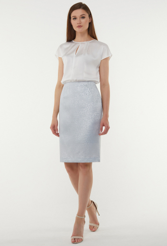 Юбка выполнена из однотонной ткани, прилегающая в области бедер и зауженная к низу, длиной за колено. Юбка на подкладке, передняя и задняя части с талиевыми вытачками. По линии талии юбка на притачном поясе с эластичной тесьмой и застежкой на две петли и пуговицы, сзади в нижней части шлица.