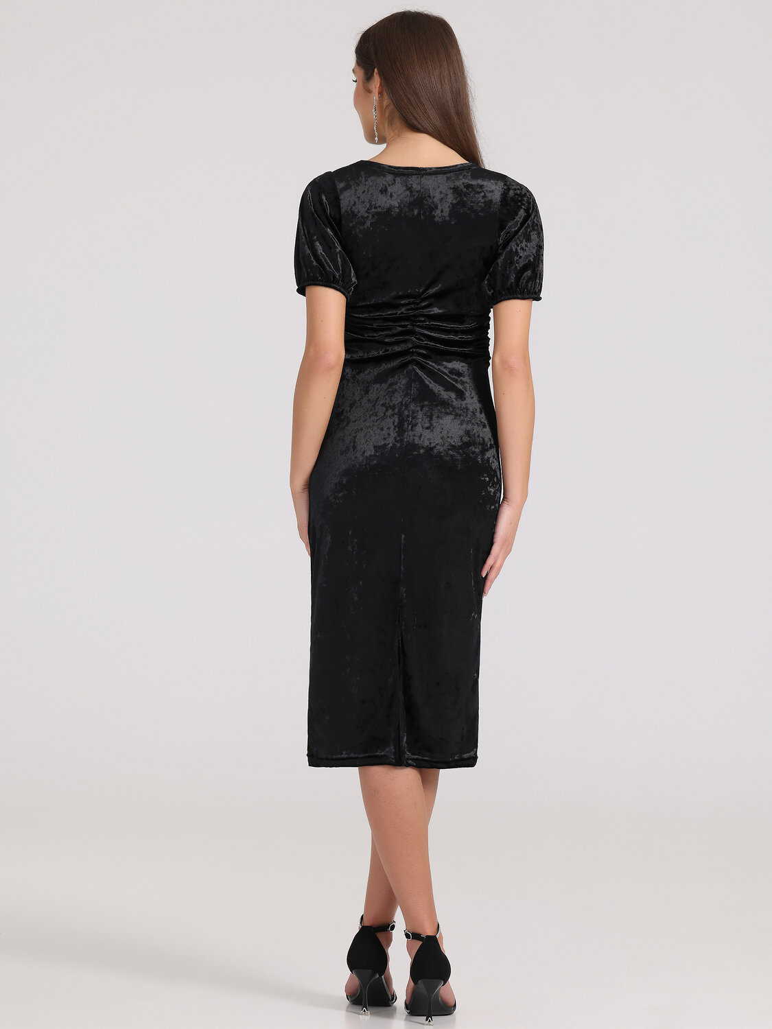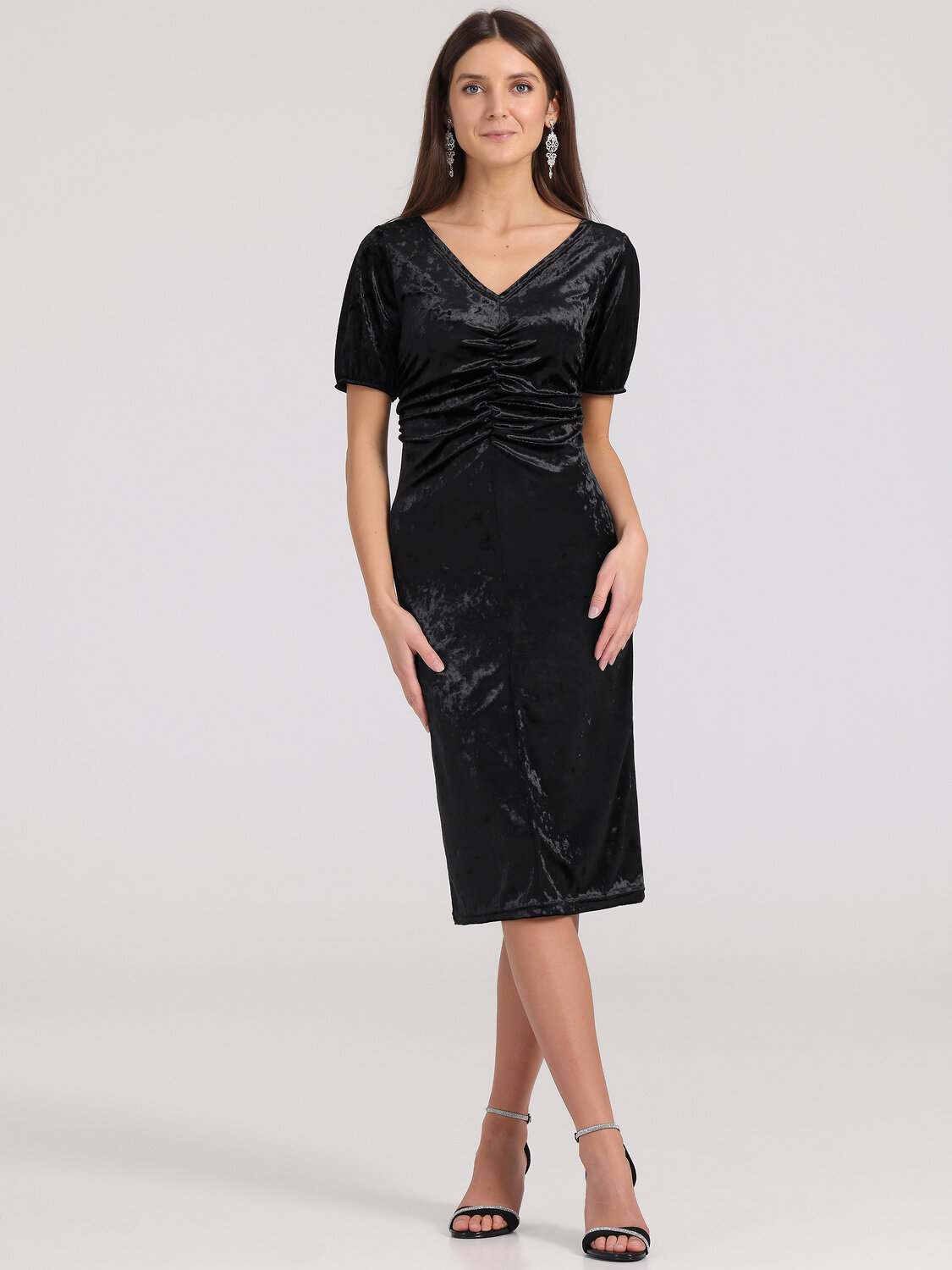 Стильное платье выполнено из мягкого велюрового полотна. Изделие прилегающего силуэта с углубленным V-образным вырезом горловины. Короткие рукава. Линию талии подчеркивает эффектная сборка, юбка с разрезом по спинке. Отличный вариант для праздника! Уход: деликатная машинная стирка (руками не стирать!) при температуре 40 градусов, без предварительного замачивания.