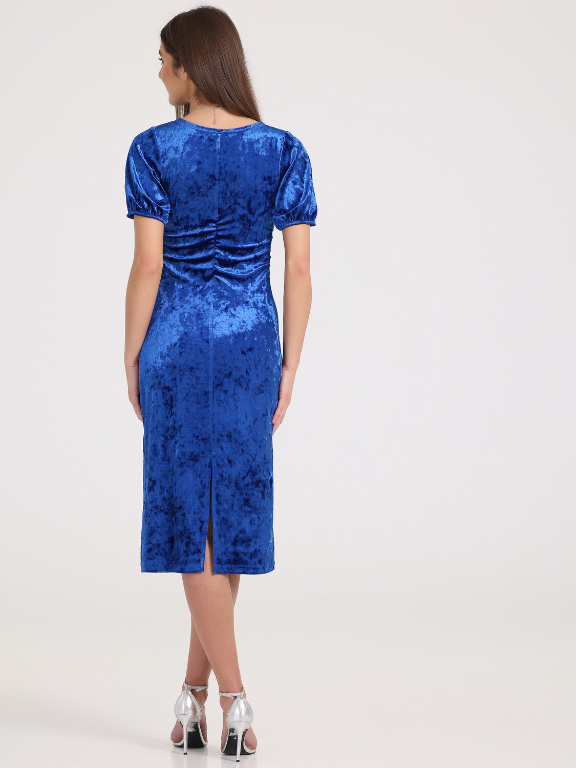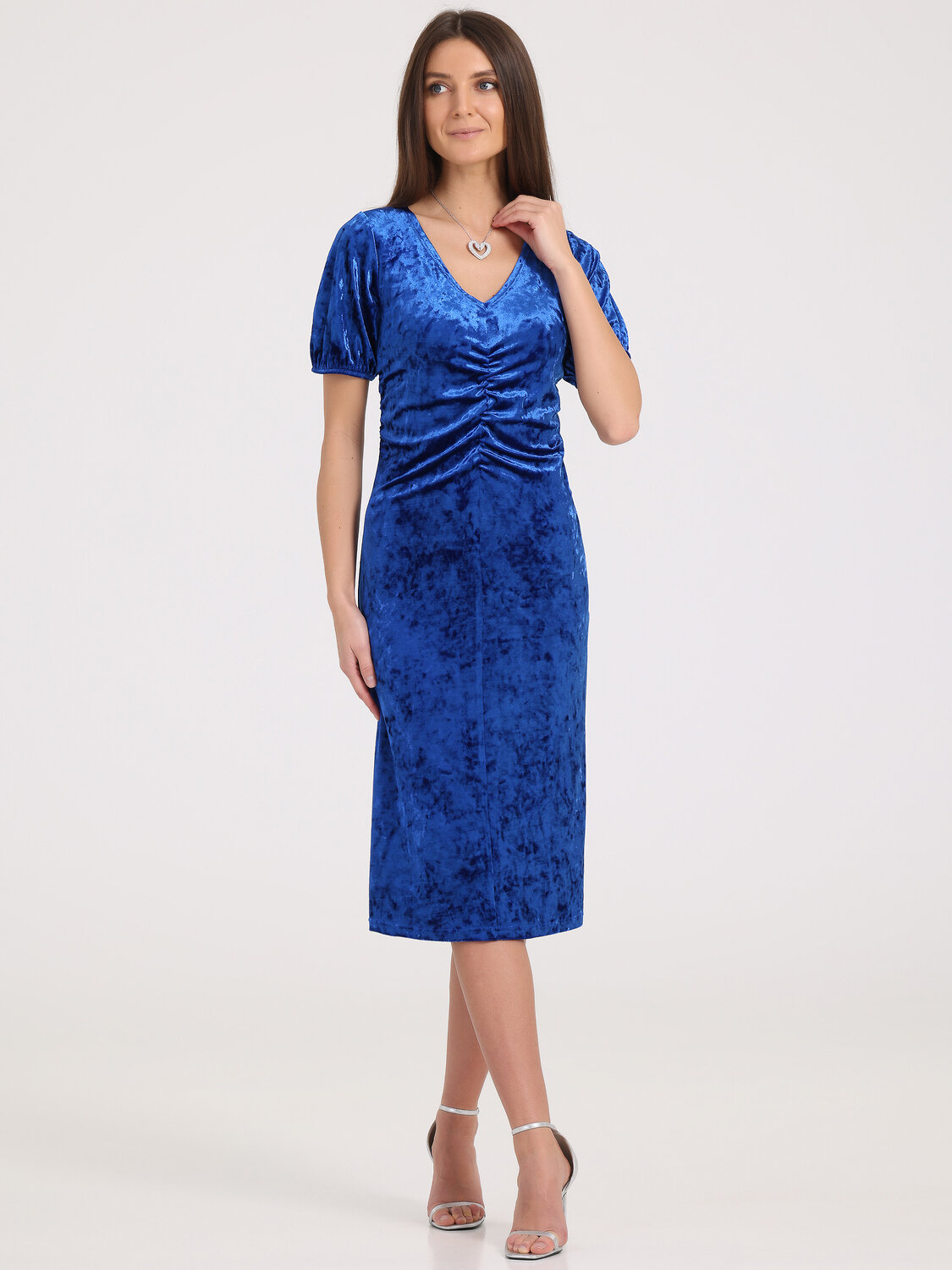 Стильное платье выполнено из мягкого велюрового полотна. Изделие прилегающего силуэта с углубленным V-образным вырезом горловины. Короткие рукава. Линию талии подчеркивает эффектная сборка, юбка с разрезом по спинке. Отличный вариант для праздника! Уход: деликатная машинная стирка (руками не стирать!) при температуре 40 градусов, без предварительного замачивания.