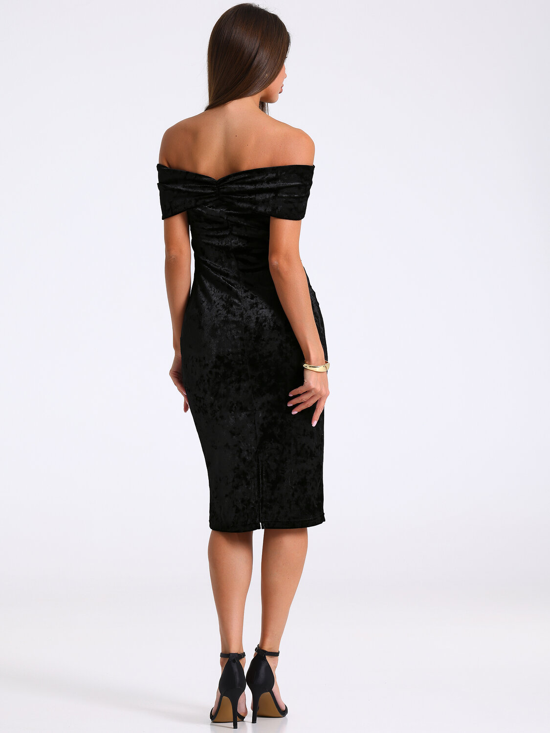 Нарядное женское платье выполнено из мягкого велюрового полотна. Изделие прилегающего силуэта, с открытыми плечами и разрезом по спинке. Отвороты украшены драпировкой. Уход: деликатная машинная стирка (руками не стирать!) при температуре 40 градусов, без предварительного замачивания.