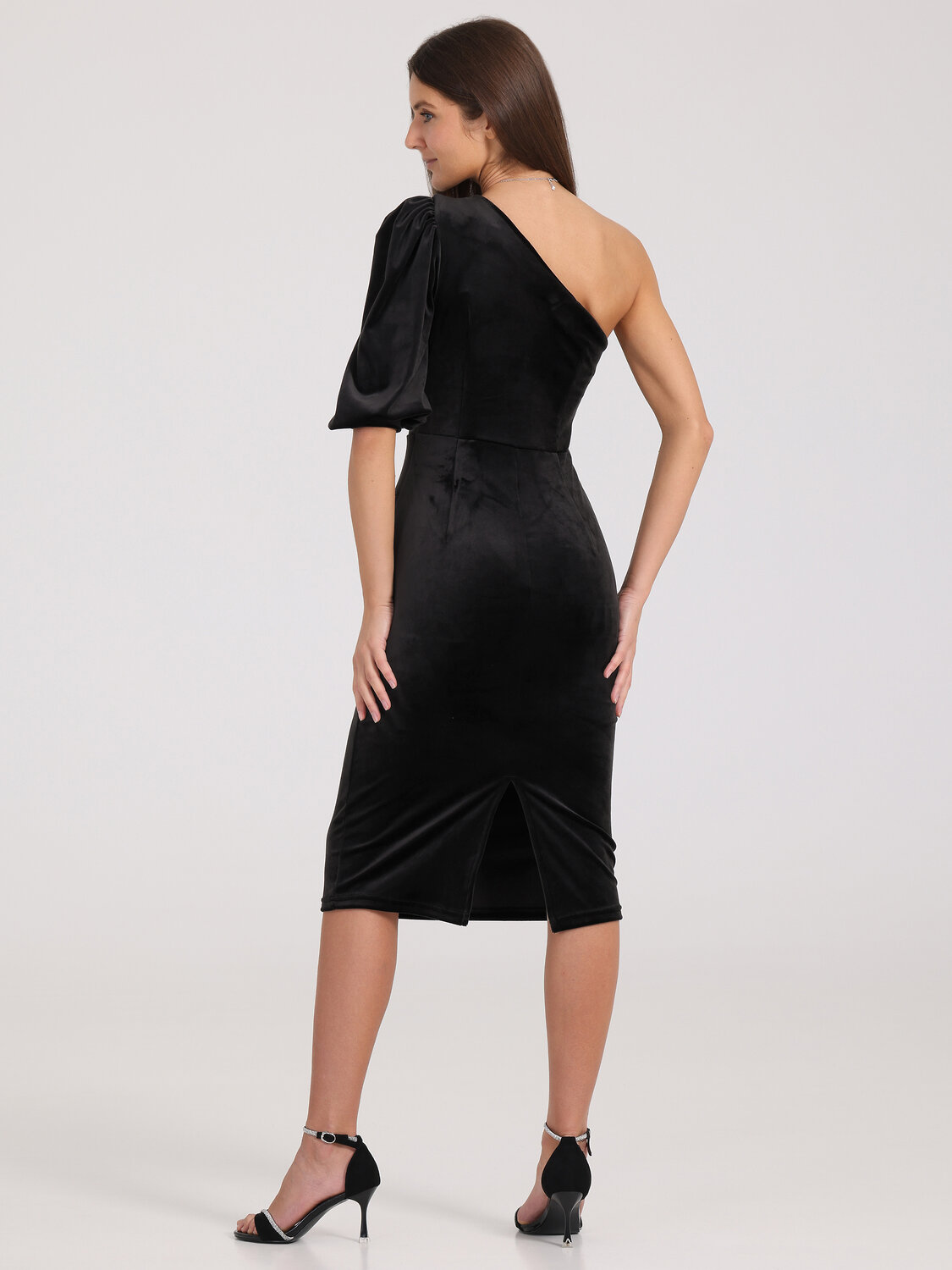 Стильное платье выполнено из мягкого велюрового полотна. Изделие прилегающего силуэта, отрезное по линии талии, с вытачками по полочке и спинке. Асиметричный вырез горловины на одно плечо. Рукав длиной три четверти на манжете украшен аккуратной драпировкой. Идеальный выбор для праздника! Уход: деликатная машинная стирка (руками не стирать!) при температуре 40 градусов, без предварительного замачивания.