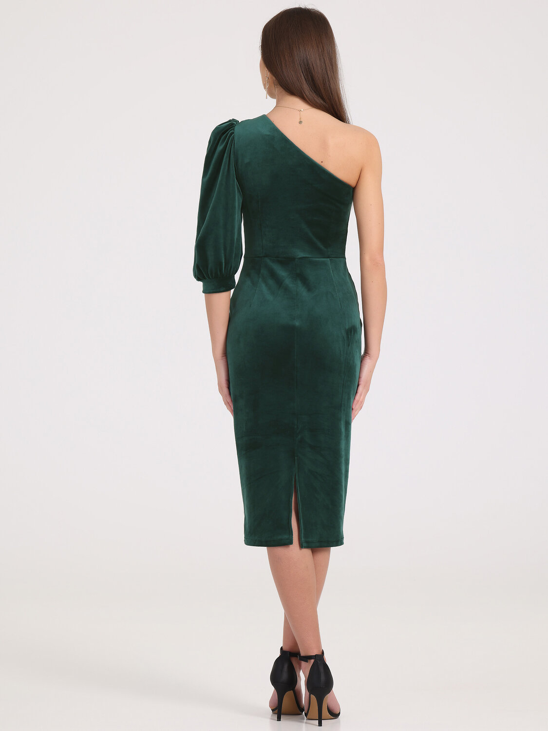 Стильное платье выполнено из мягкого велюрового полотна. Изделие прилегающего силуэта, отрезное по линии талии, с вытачками по полочке и спинке. Асиметричный вырез горловины на одно плечо. Рукав длиной три четверти на манжете украшен аккуратной драпировкой. Идеальный выбор для праздника! Уход: деликатная машинная стирка (руками не стирать!) при температуре 40 градусов, без предварительного замачивания.
