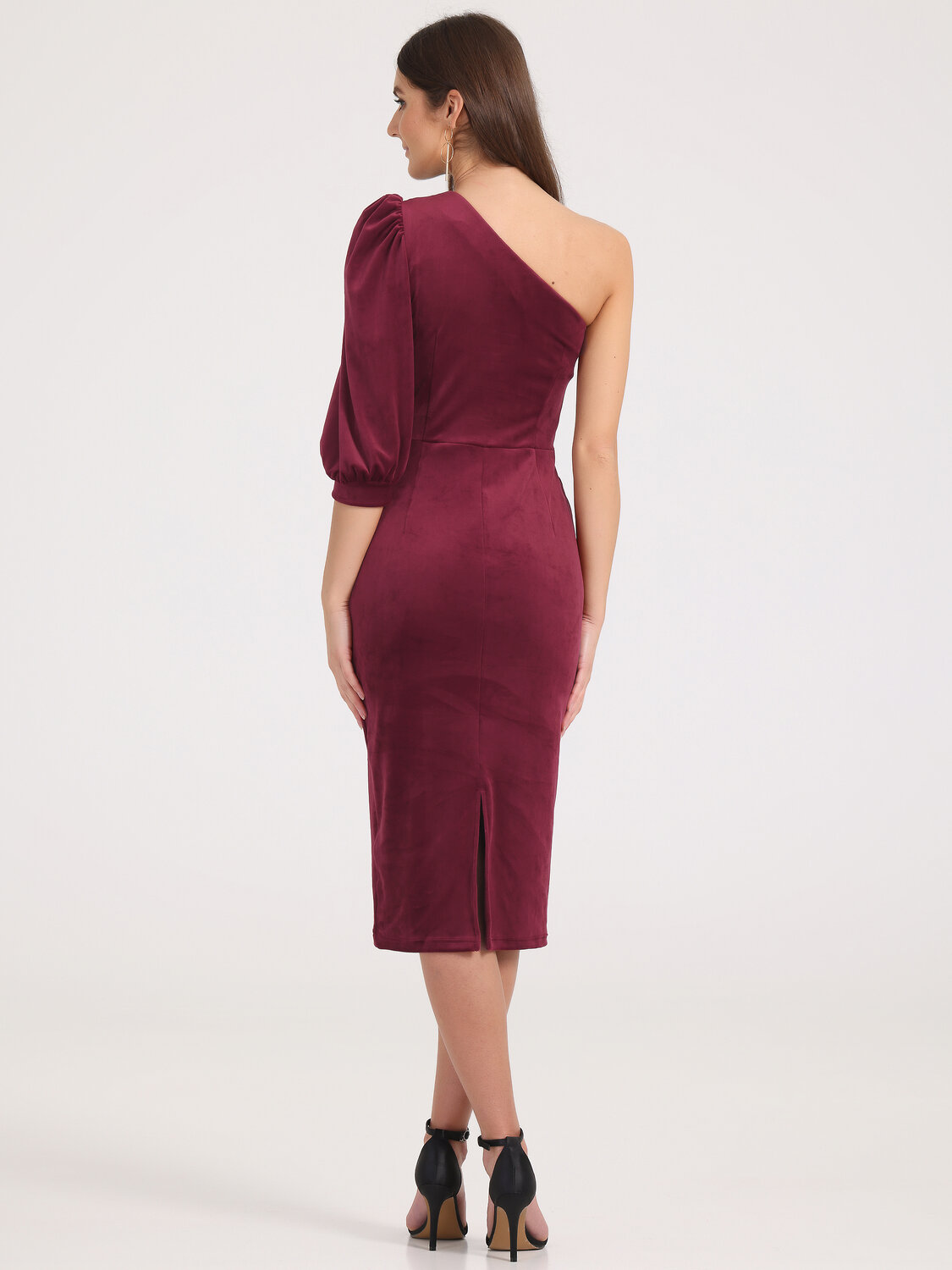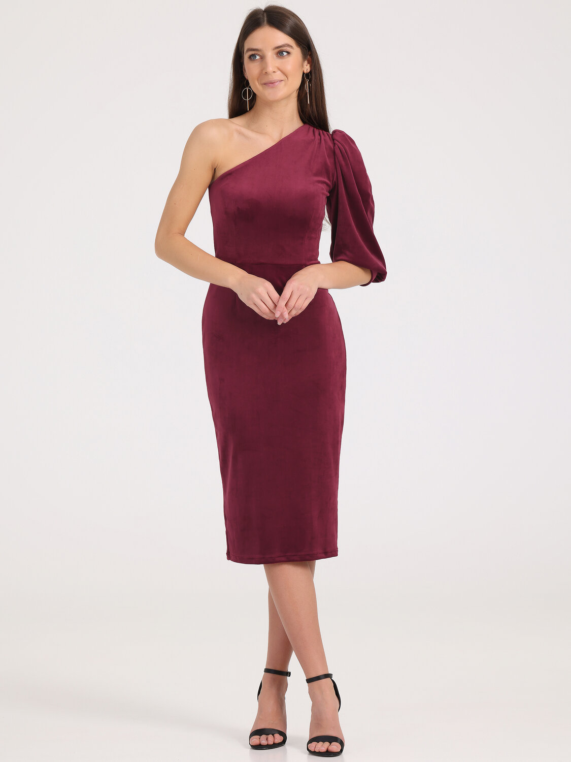 Стильное платье выполнено из мягкого велюрового полотна. Изделие прилегающего силуэта, отрезное по линии талии, с вытачками по полочке и спинке. Асиметричный вырез горловины на одно плечо. Рукав длиной три четверти на манжете украшен аккуратной драпировкой. Идеальный выбор для праздника! Уход: деликатная машинная стирка (руками не стирать!) при температуре 40 градусов, без предварительного замачивания.