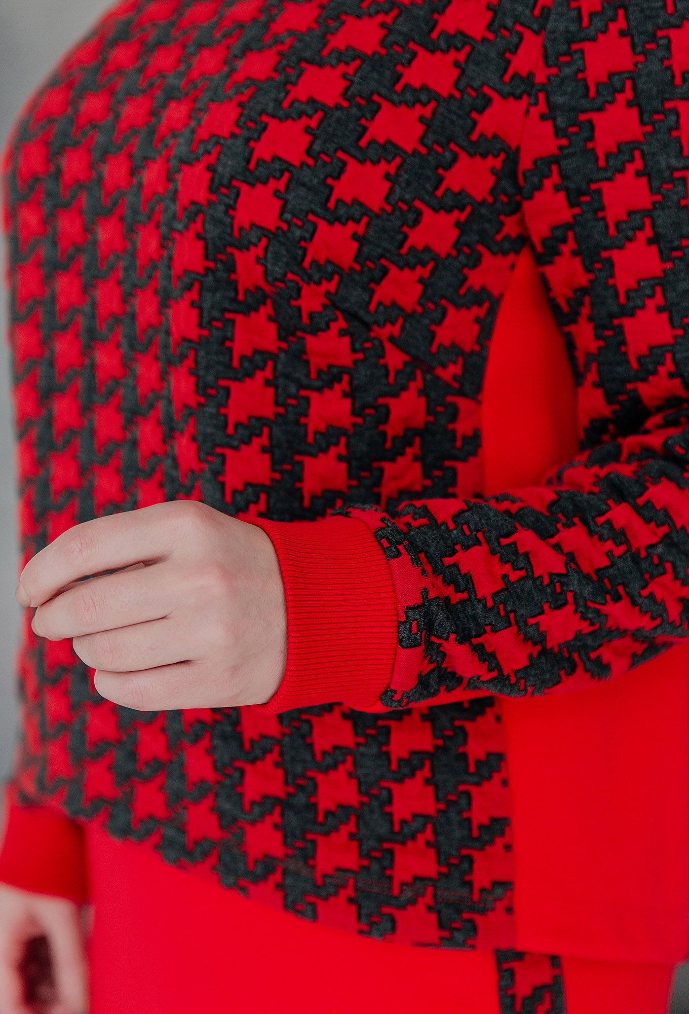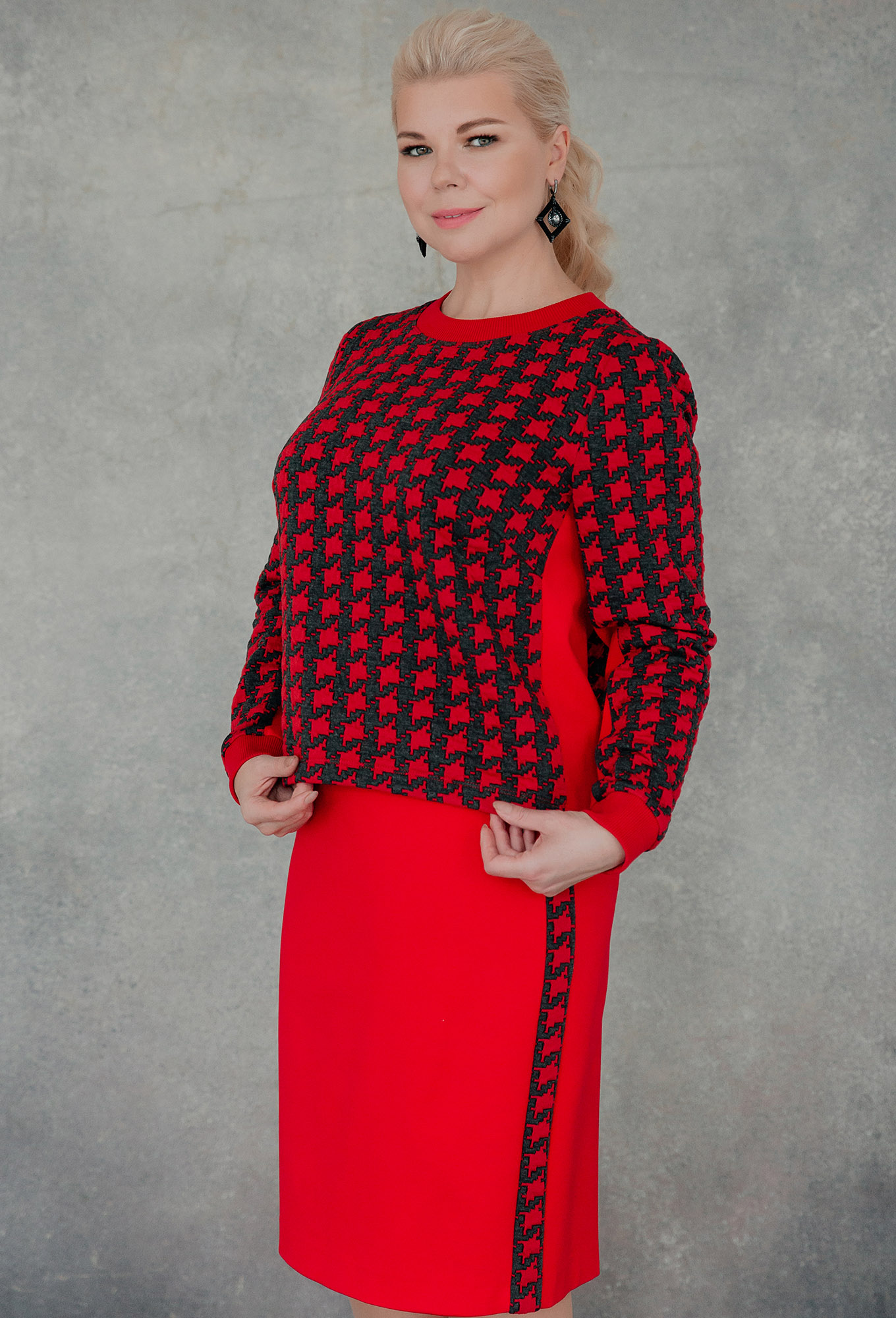 Свитшот прямого силуэта с длинным рукавом с притачными манжетами. Горловина круглая с трикотажным довязом. Юбка прямого силуэта с отделочными вставками по боковым швам. Застежка на потайную тесьму- молнию в среднем шве спинки. По линии талии по спинке – резинка. Шлица в среднем шве спинки.