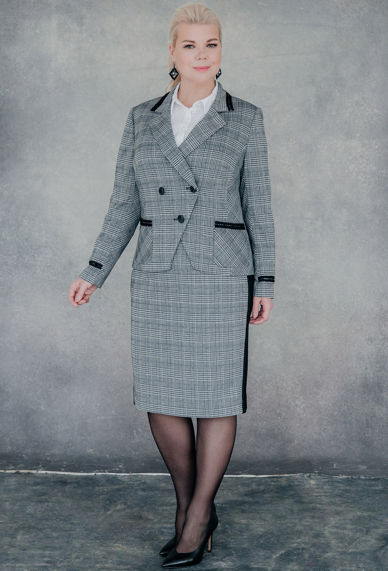 Юбка прямого силуэта с отделочными вставками по боковым швам. Застежка на потайную тесьму-молнию в среднем шве спинки. По линии талии по спинке – резинка. Шлица в среднем шве спинки.