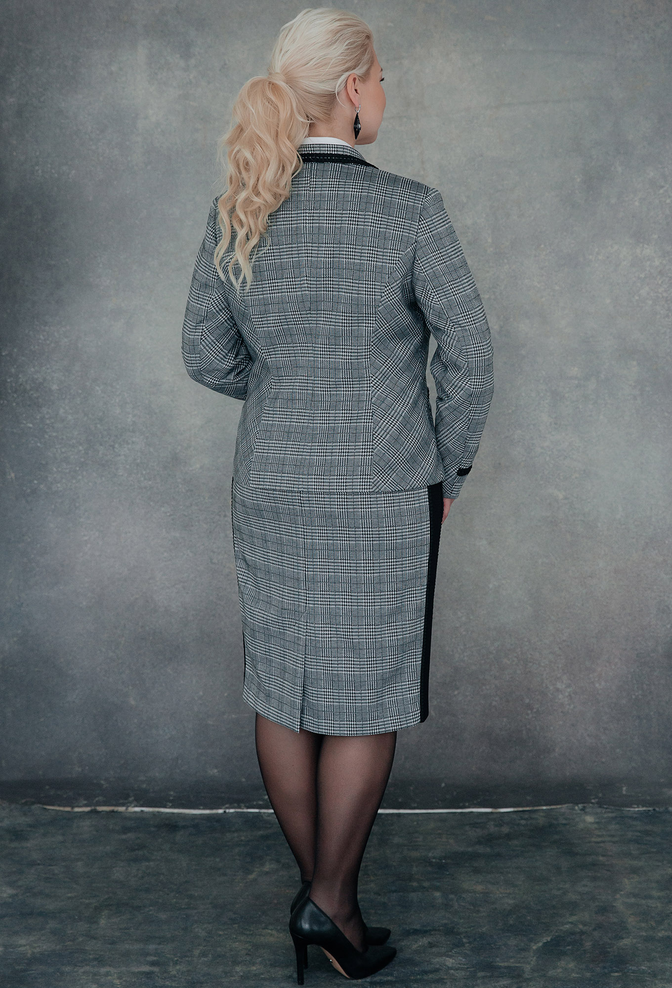 Жакет на подкладке полуприлегающего силуэта с пиджачным воротником и застежкой на три пуговицы, рукава длинные двухшовные. По переду накладные карманы.