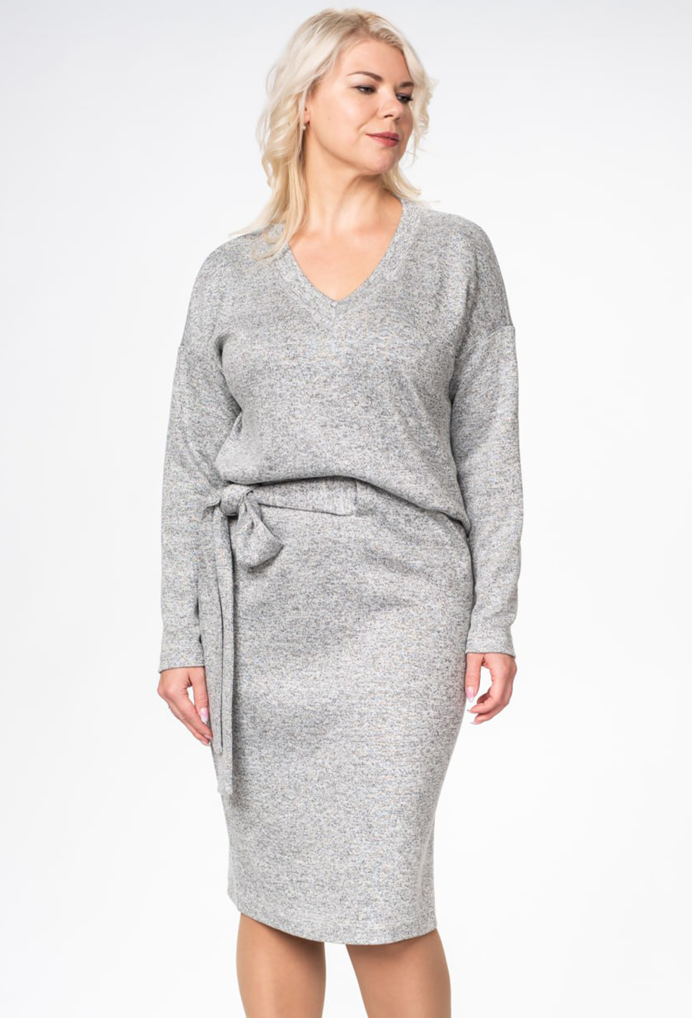 Женское платье прямого силуэта с длинным рукавом. Горловина у платья V-образной формы с притачной бейкой. По переду и спинке декоративный пояс завязка.