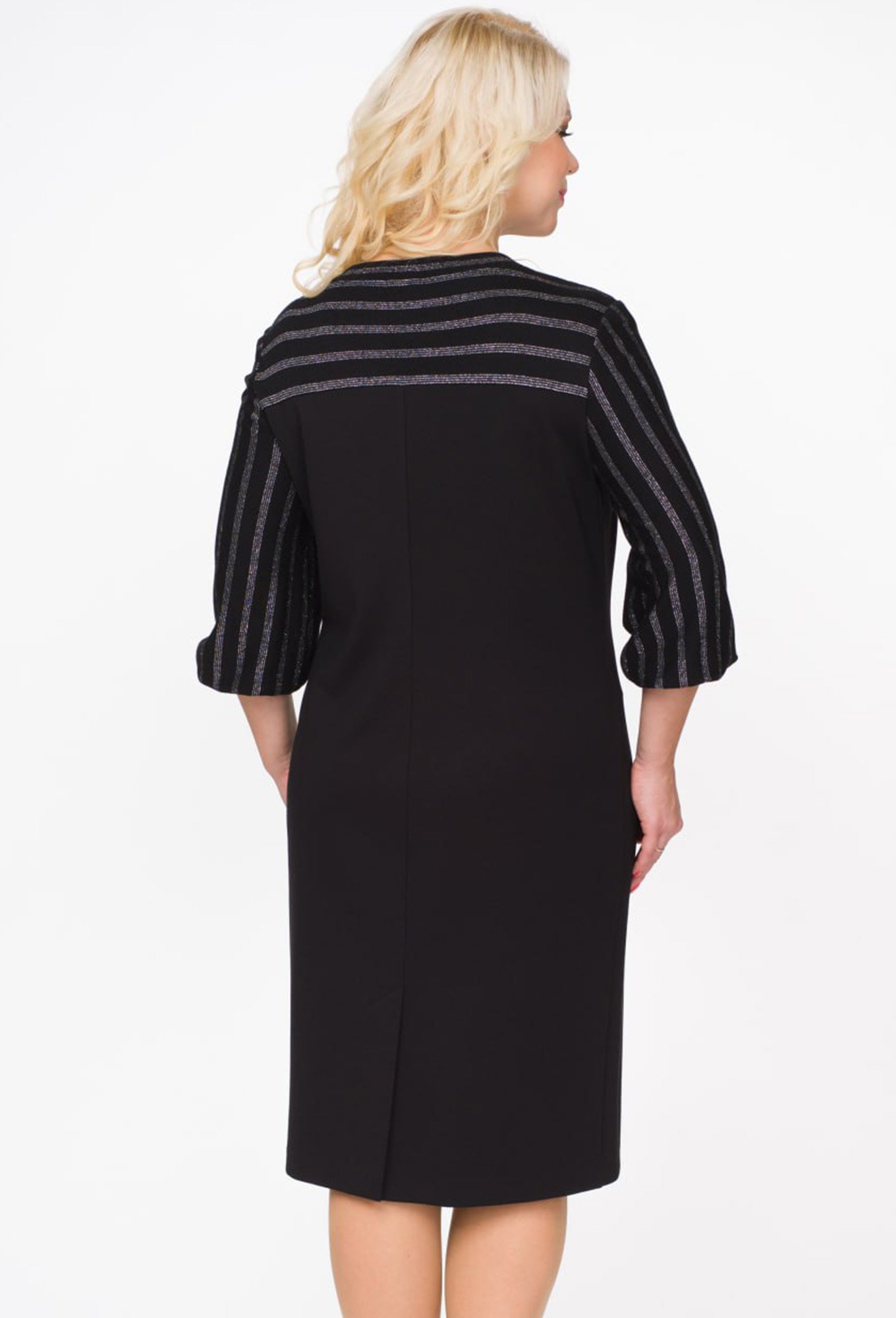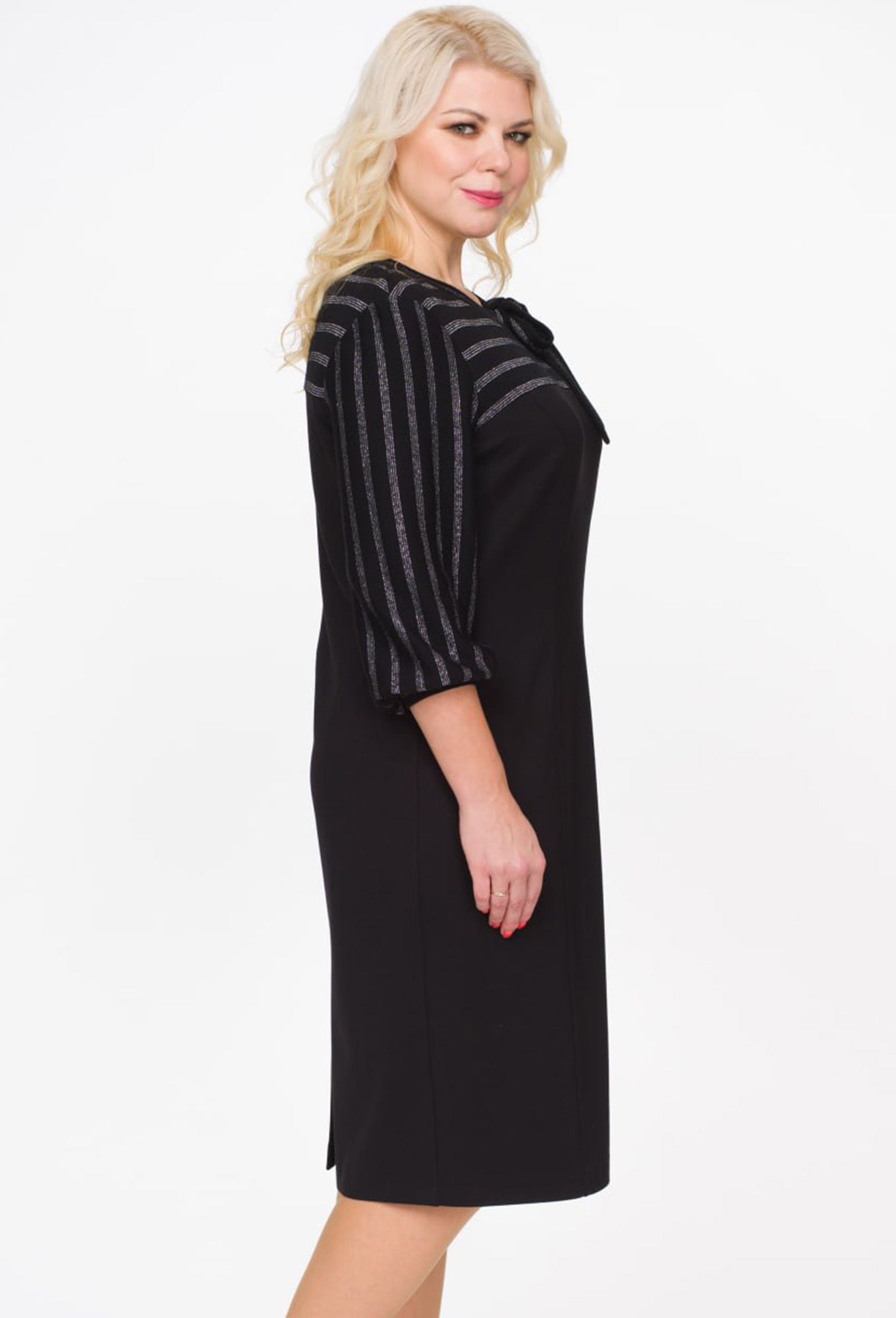 Платье прямого силуэта рубашечного покроя. Горловина округлая с воротником стойкой. По переду и спинке притачные кокетки и имитация отлетного лифа. По низу лифа притачная манжета переходящая в декоративную завязку. По низу платья по спинке шлица в среднем шве.
