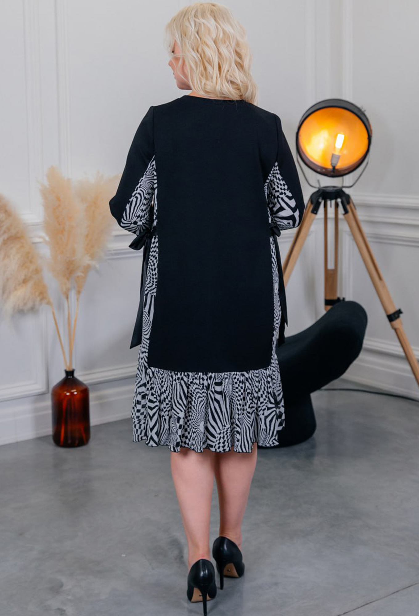 Платье комбинированное расширенного силуэта с рукавом 3/4 с притачными манжетами. Горловина округлая с притачной бейкой. По низу переда и спинки и по бокам вставки из контрастной плиссировки и декоративные завязки.