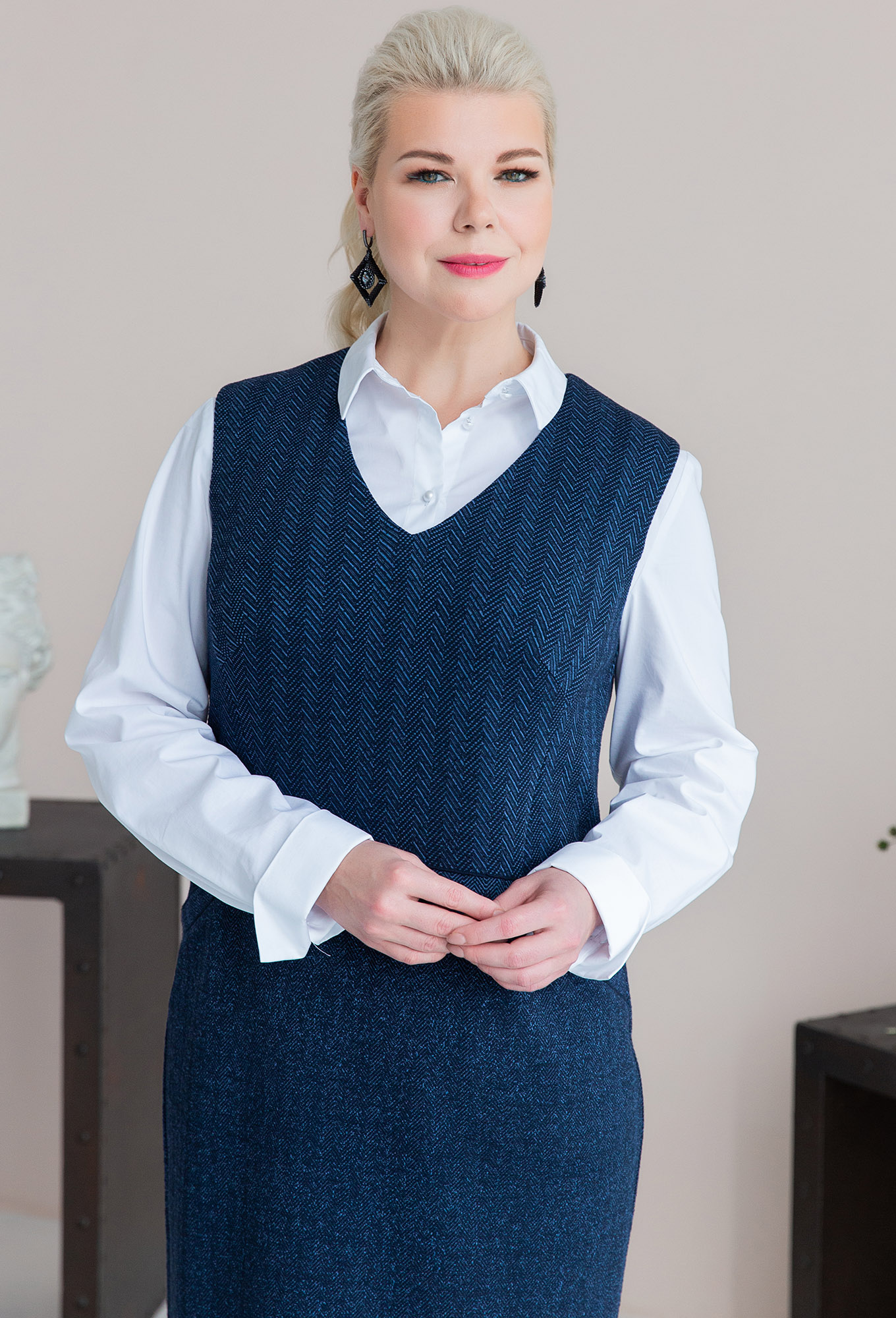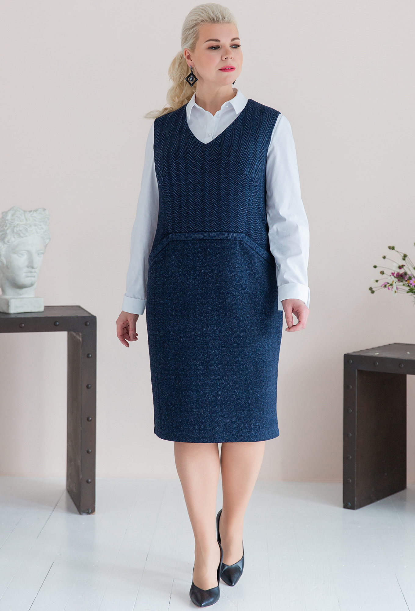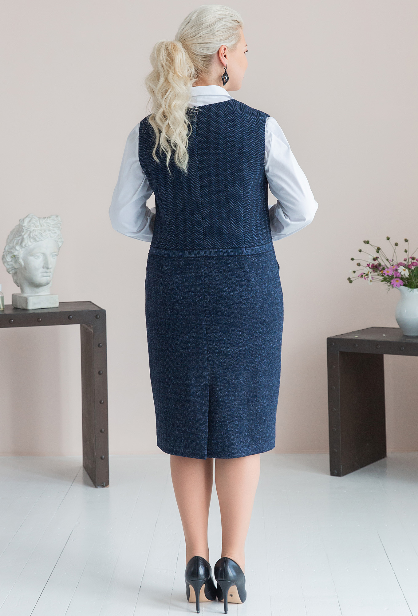 Платье полуприлегающего силуэта без рукава с V-образным вырезом горловины. По переду карманы в шве с листочкой. По спинке застежка на потайную молнию по среднему шву спинки и шлица по низу.