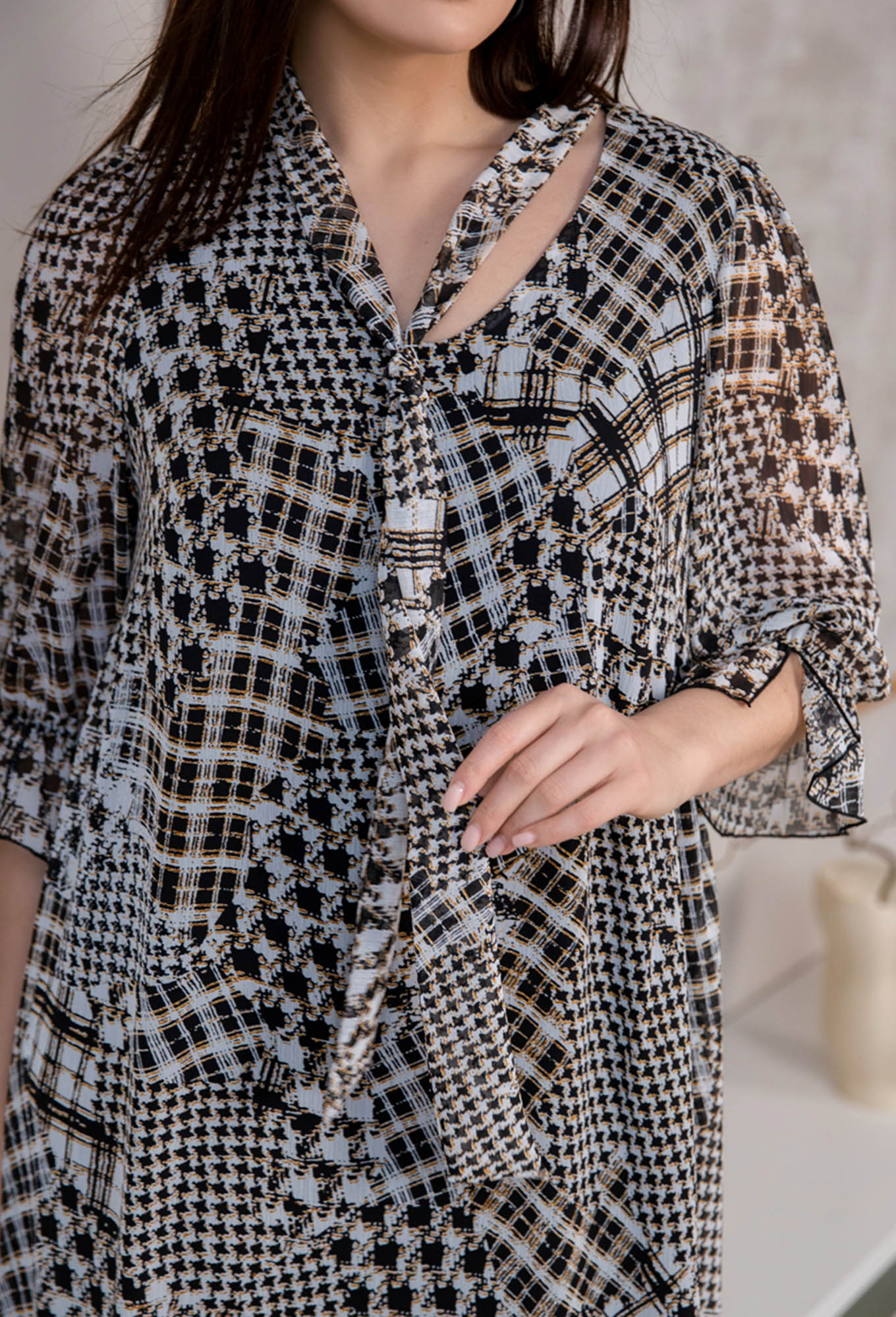 Платье А-образного силуэта с рукавом ¾ с притачной манжетой и резинкой по шву притачивания. Горловина V-образной формы с воротником стойкой по спинке переходящей в завязку. По низу платья притачные воланы с разрезами между ними.