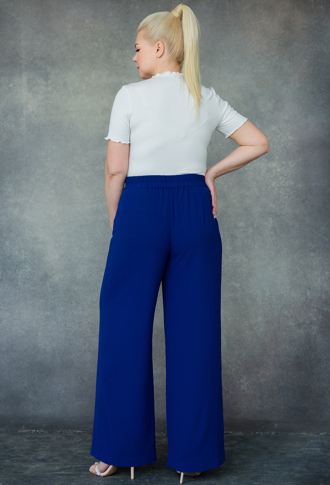 Брюки прямые с застежкой на потайную молнию и пуговицу в боковом шве. По спинке резинка по поясу.