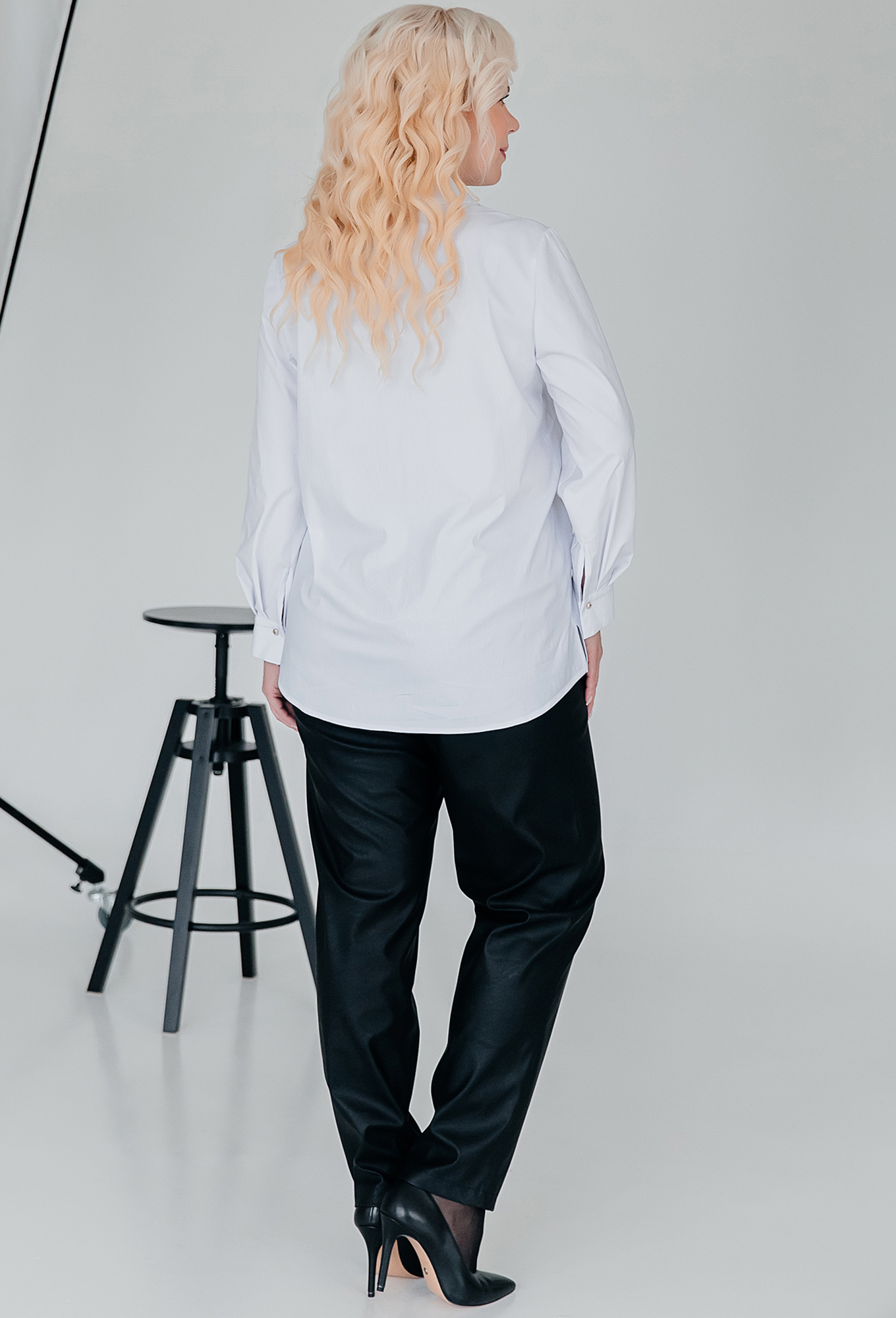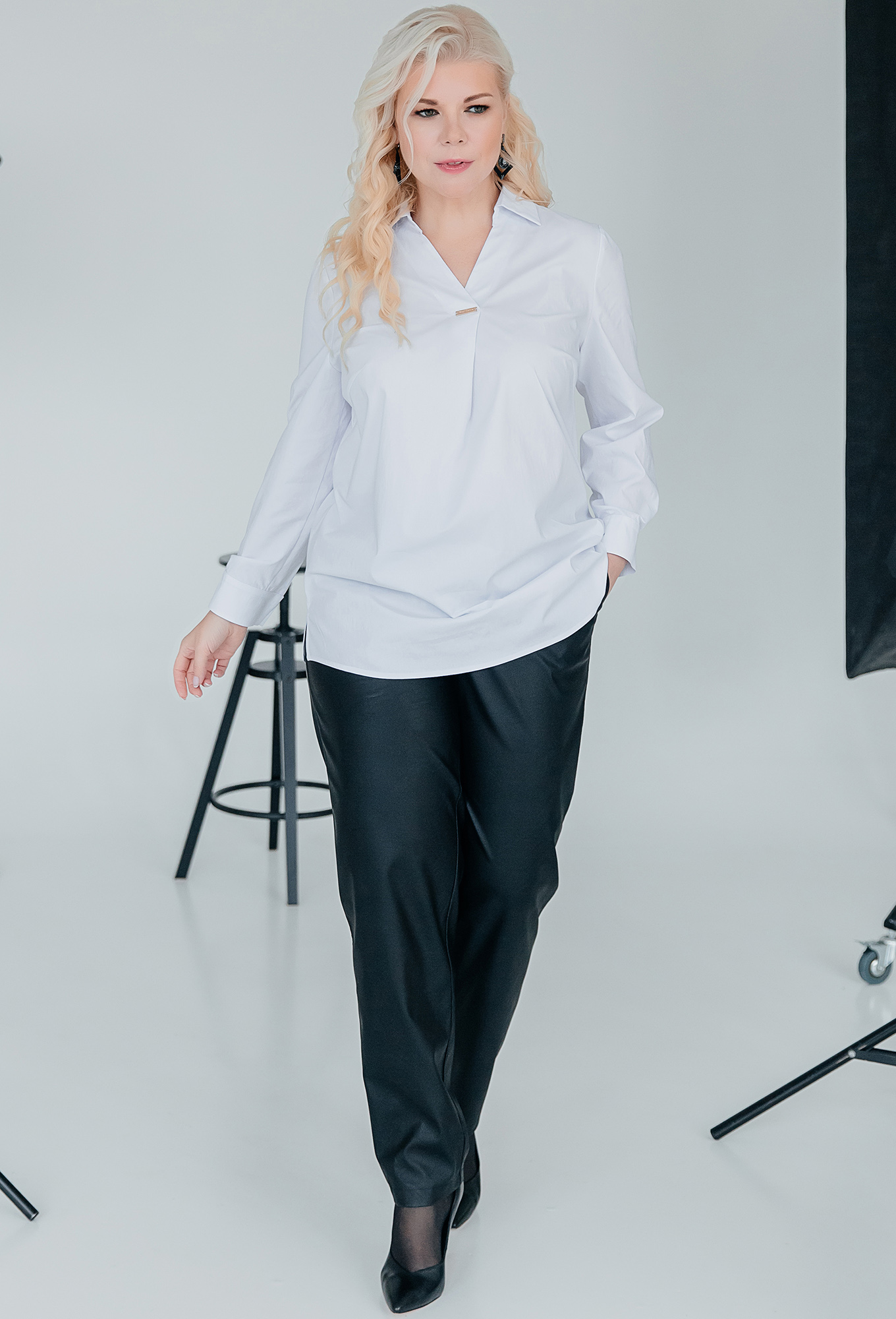 Блуза прямого силуэта с длинным рукавом с манжетой. Горловина V- образной формы с рубашечным воротником. По переду односторонняя складка с декоративной пришивной пластиной. По боковым швам – разрезы.