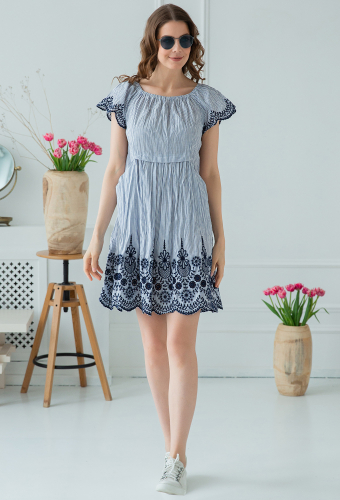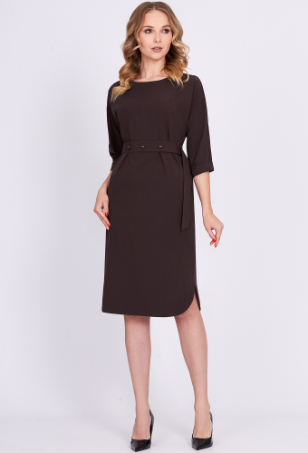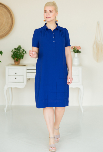 Платье прямого силуэта с коротким рукавом. Горловина округлая с рубашечным воротником. Застежка по переду на планку и петли-пуговицы. По детали переда декоративная застрочка защипами. По спинке V-образный вырез. Рукав со сборкой по окату.