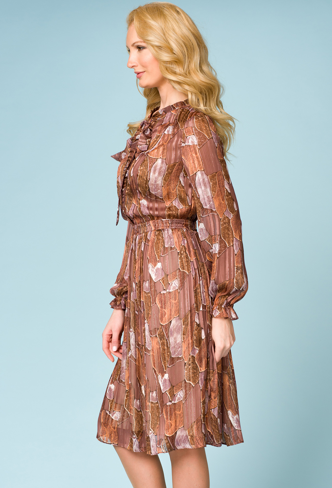Платье полуприлегающего силуэта с длинным рукавом. Горловина округлая с воротником стойкой переходящей в бант, застежка на петли и
