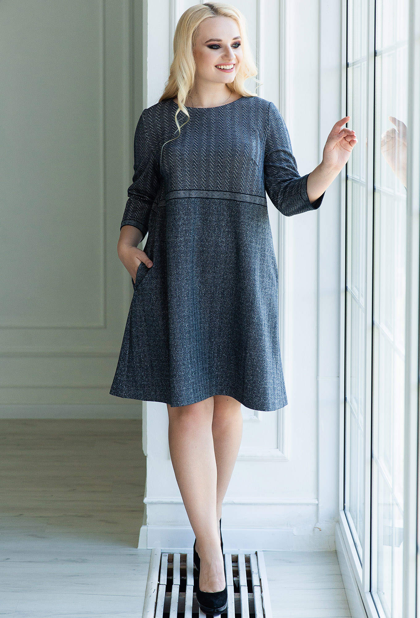 Платье силуэта трапеция с рукавом 3/4. Горловина округлая, карманы в боковом шве.