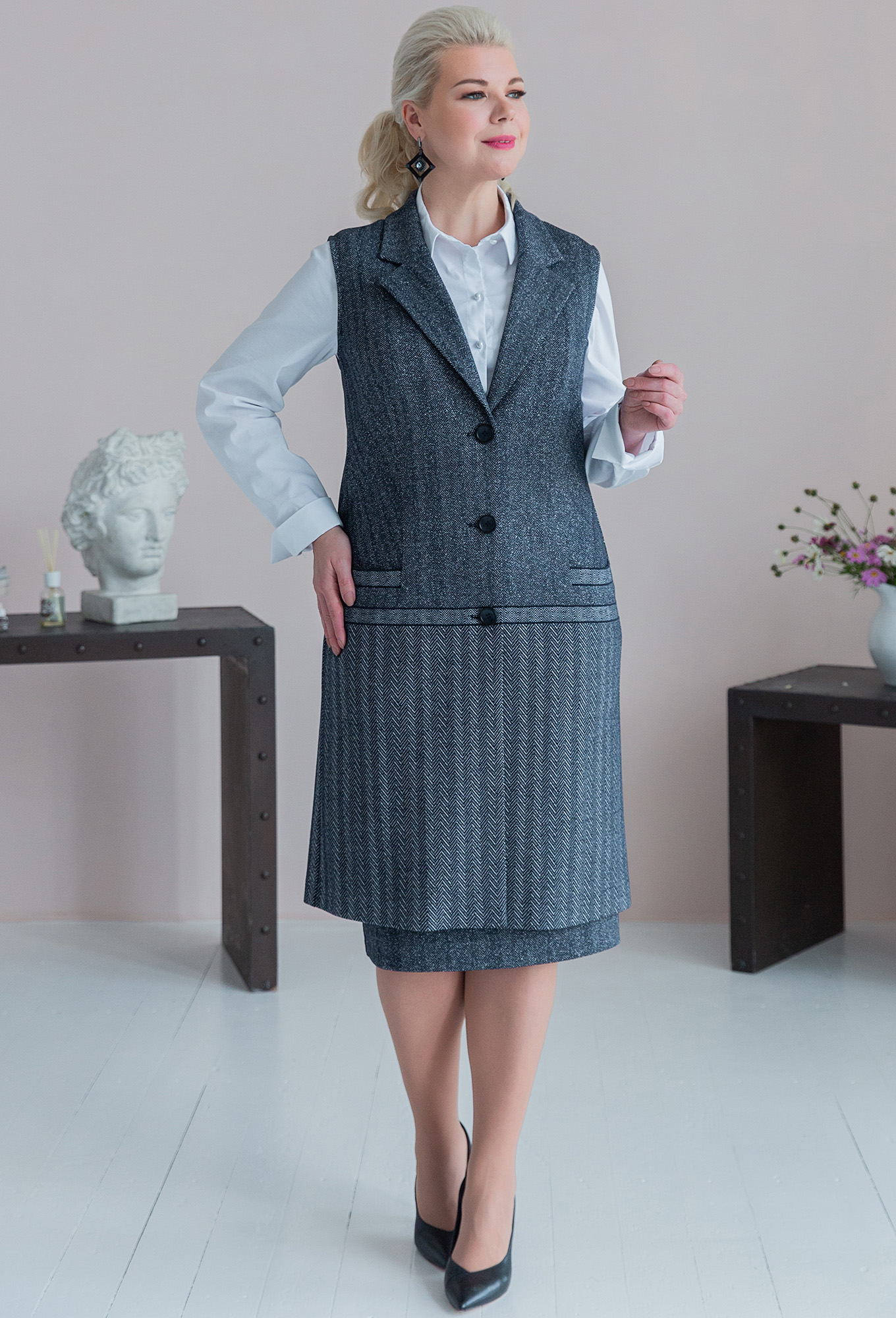 Жилет прямого силуэта с пиджачным воротником и застежкой на петли и пуговицы. По переду карманы с листочкой в шве. По спинке по низу изделия – шлица.