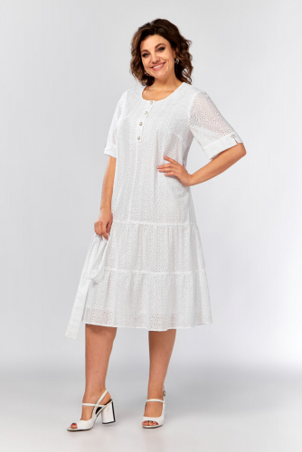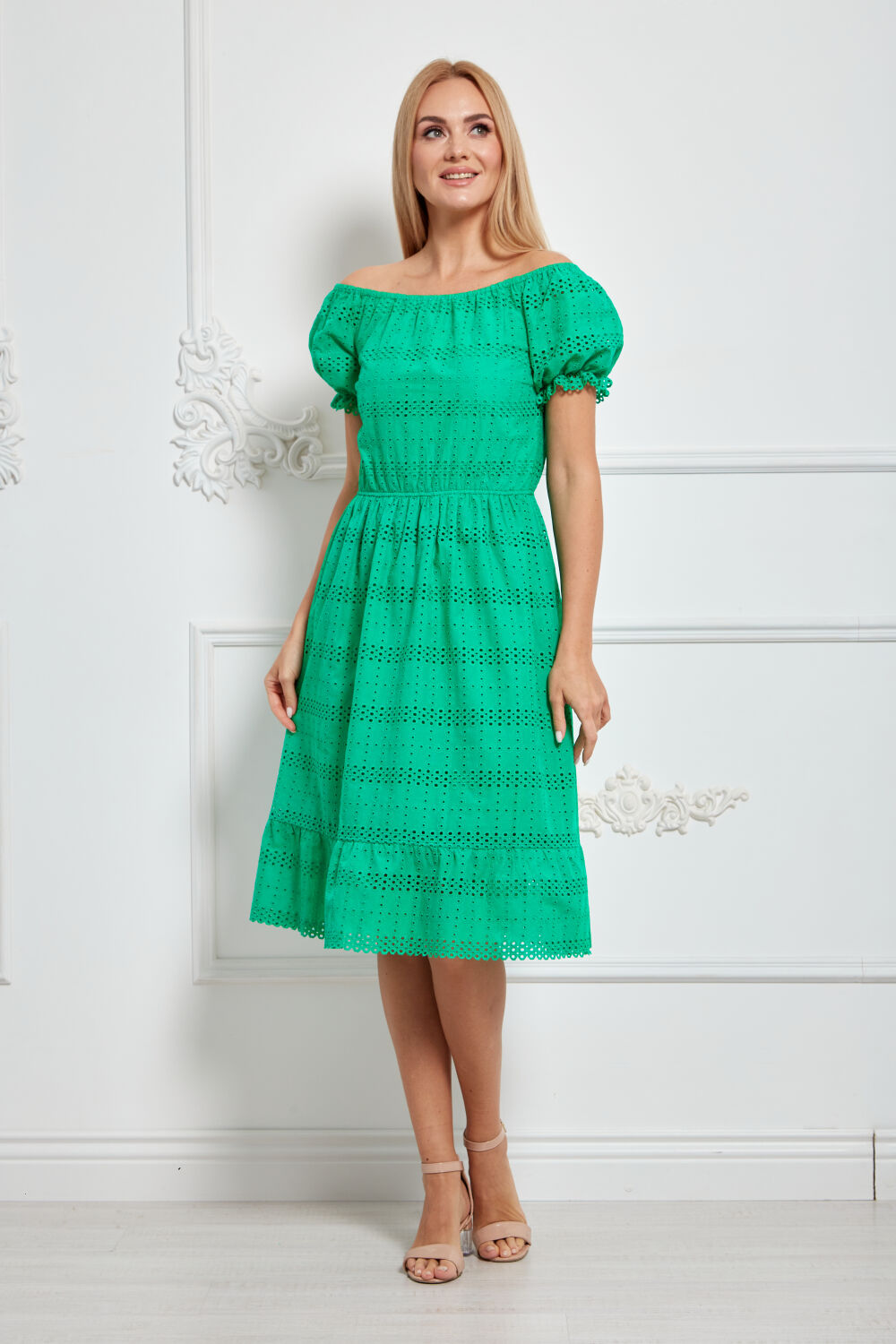 Платье женское из вышитой ткани с хлопком и однотона. Прилегающего силуэта с расклешённым низом, длиной до колена, вырез горловины глубокий, фиксируется эластичной тесьмой, рукав пышный со сборками, по спинке в среднем шве потайная молния, по низу изделия волан, платье на подкладке.