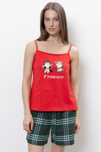 Пижама женская состоит из топа на тонких регулируемых бретелях и шорт свободного прилегания. Шорты средней длины с функциональными карманами. В поясе кулиса с контрастной лентой. Пижама представлена в двух цветовых решениях. Топ пижамы декорирован тематическим минималистичным принтом.