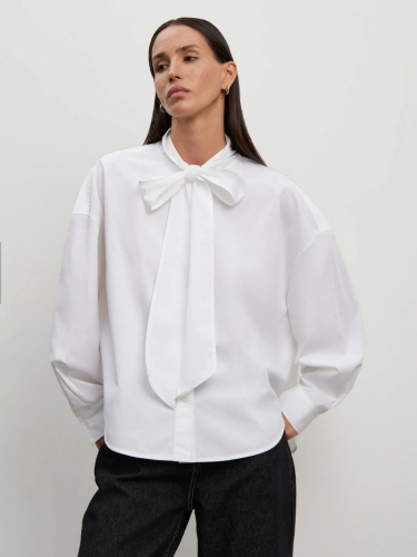 Модная рубашка с бантом придаст образу большей эстетичности. Выполнена из хлопка в белом цвете. Модель прямого кроя имеет спущенное плечо. Сочетается с любым базовым низом, подходит для работы и торжественных случаев