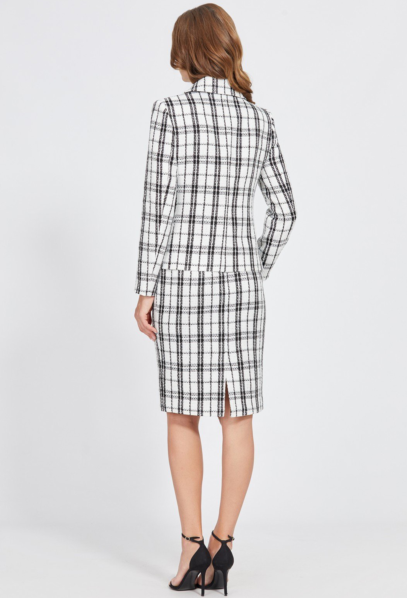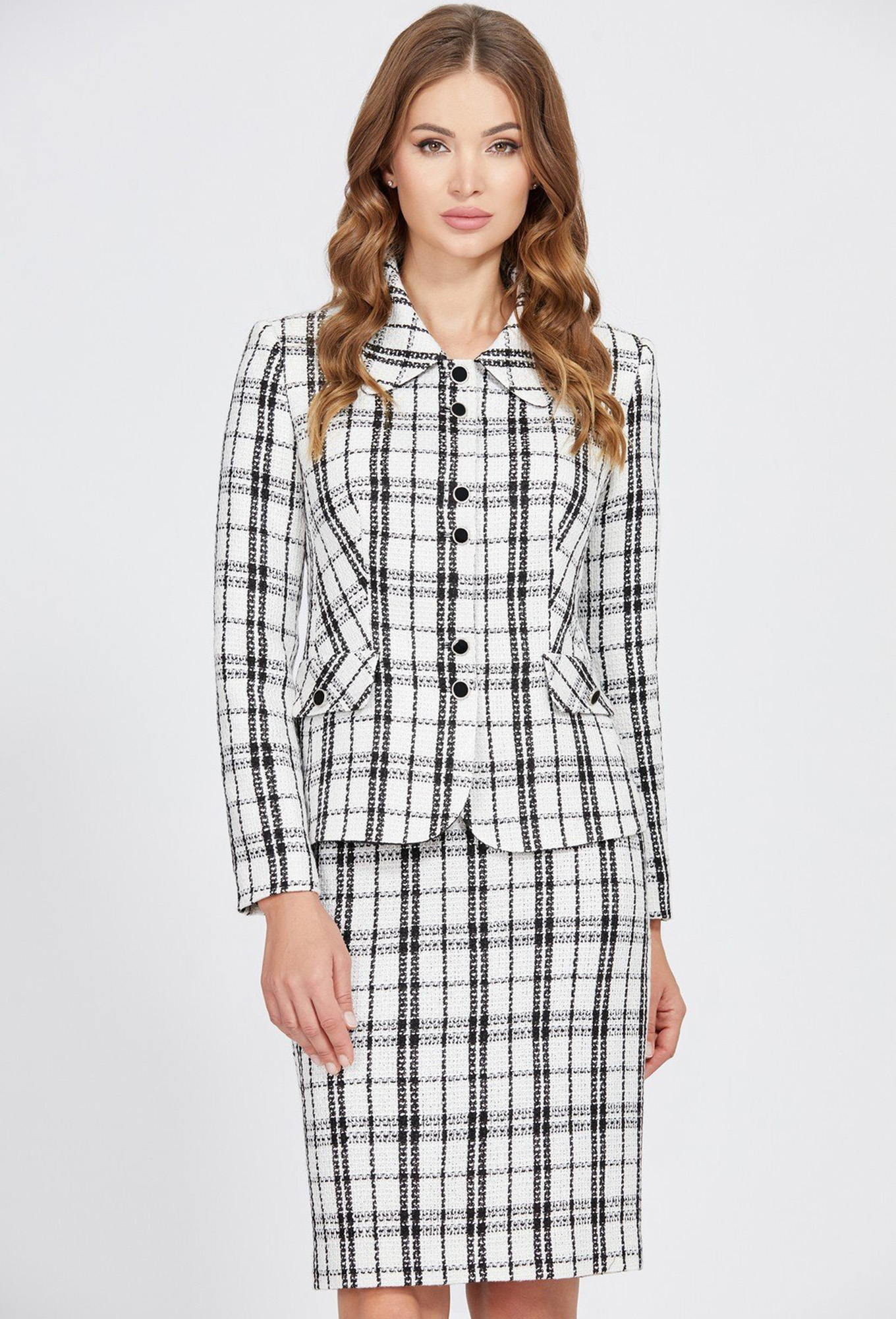 Комплект состоит из жакета и юбки. Изысканный жакет из мягкого фактурного твида в бело-черную клетку станет отличным дополнением к гардеробу современной женщины. Эта полуприлегающая модель оснащена отложным воротником и украшена декоративными клапанами, придающими образу законченность. Эффектные контрастные пуговицы вносят праздничное настроение и придают образу особую изысканность. Длинные двухшовные втачные рукава и качественная подкладка обеспечивают комфорт и превосходное качество изделия.