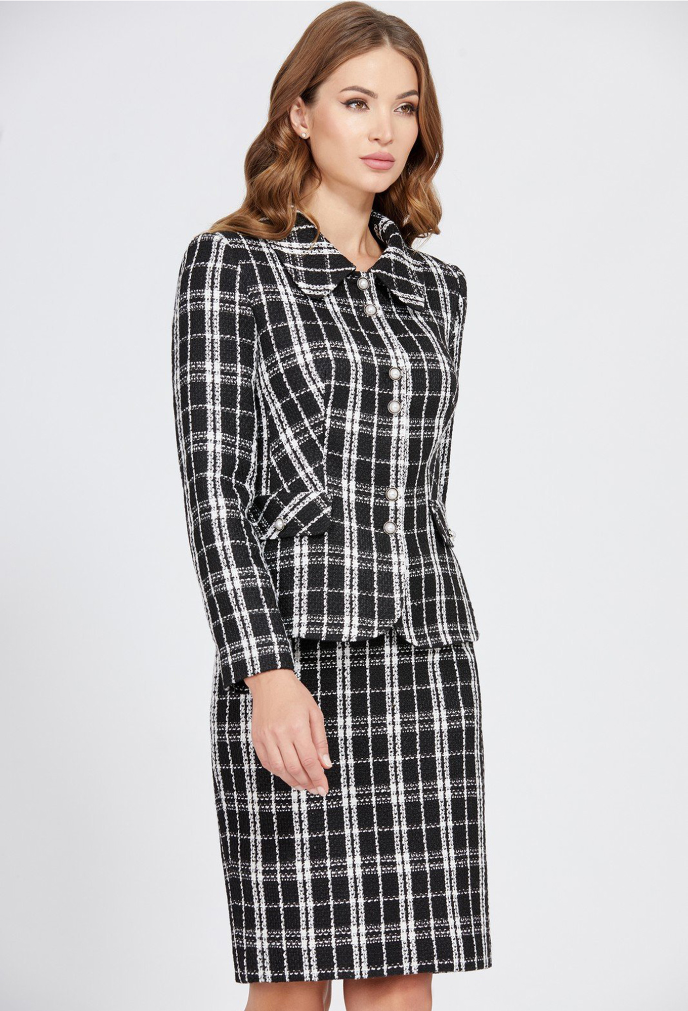 Комплект состоит из жакета и юбки. Изысканный жакет из мягкого фактурного твида в бело-черную клетку станет отличным дополнением к гардеробу современной женщины. Эта полуприлегающая модель оснащена отложным воротником и украшена декоративными клапанами, придающими образу законченность. Эффектные контрастные пуговицы вносят праздничное настроение и придают образу особую изысканность. Длинные двухшовные втачные рукава и качественная подкладка обеспечивают комфорт и превосходное качество изделия.