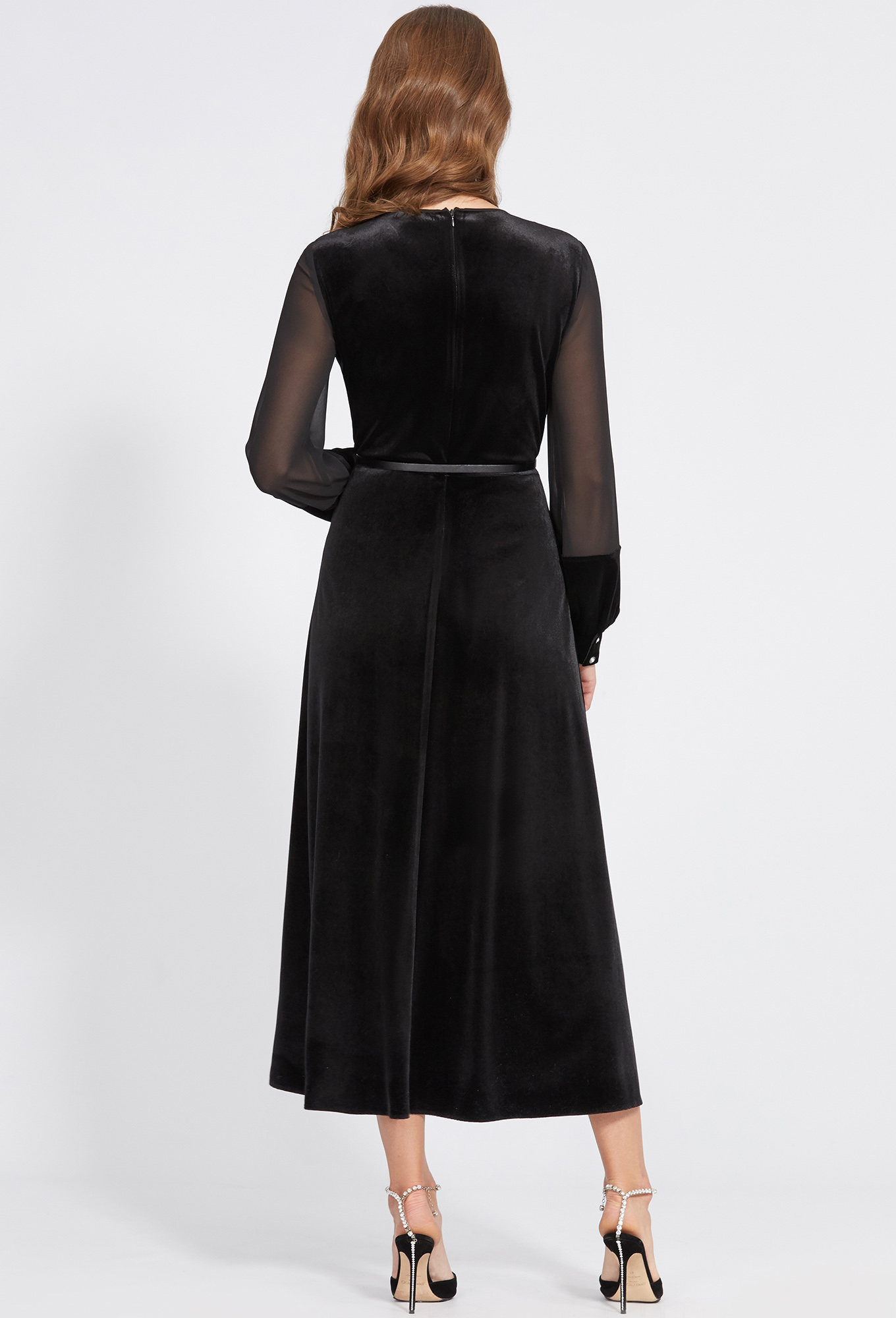 Познакомьтесь со своим самым стильным образом в платье х-образного силуэта, выполненного из бархата, придающего роскошный вид и шифона, добавляющего легкости и прозрачности модели. Привлечь особое внимание к себе также помогает интересный крой рукавов с манжетами и красивыми пуговицами и отделка кокетки в виде тесьмы с кристаллами. Длина платья достаточно длинная, чтобы обеспечить прикрытие и при этом продемонстрировать ваши ноги через разрез. В среднем шве спинки обработана застёжка на потайную молнию.