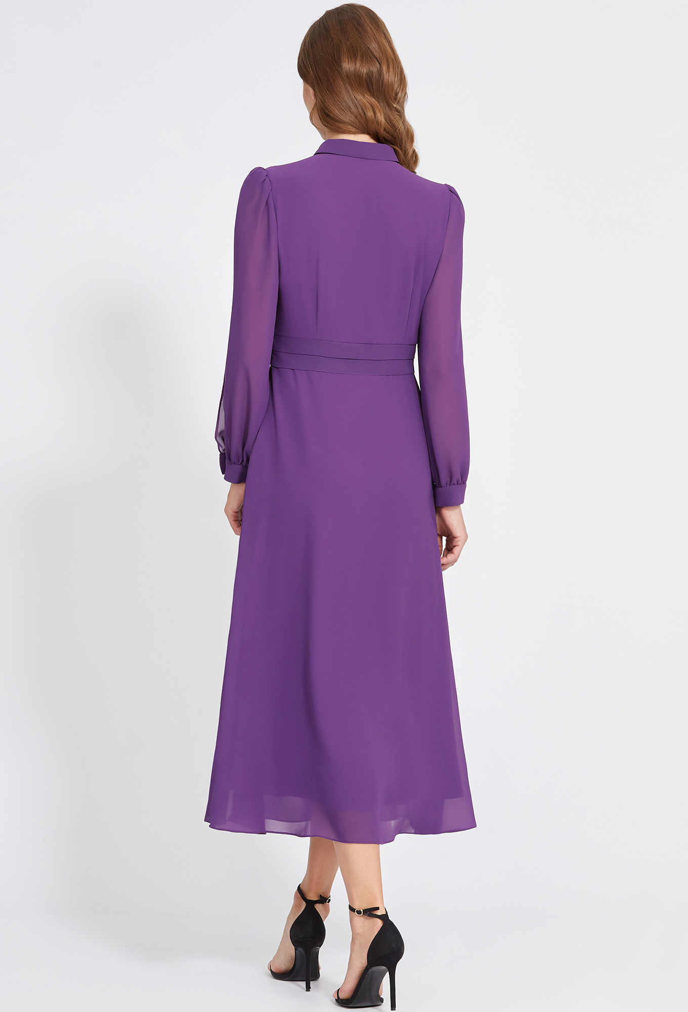 Летящее платье -макси, которое просто не терпится надеть, выполнили из приятного однотонного шифон. Модель Х-образного силуэта, со щелевидным вырезом со сборкой по горловине переда и отложным воротником со стойкой с застёжкой на навесную петлю и пуговицу, полупрозрачными рукавами-фонарик с разрезами и манжетами с застёжкой на петлю-пуговицу. А завершают этот праздничный образ две горизонтальные широкие складки, красиво подчёркивающие линию талии.