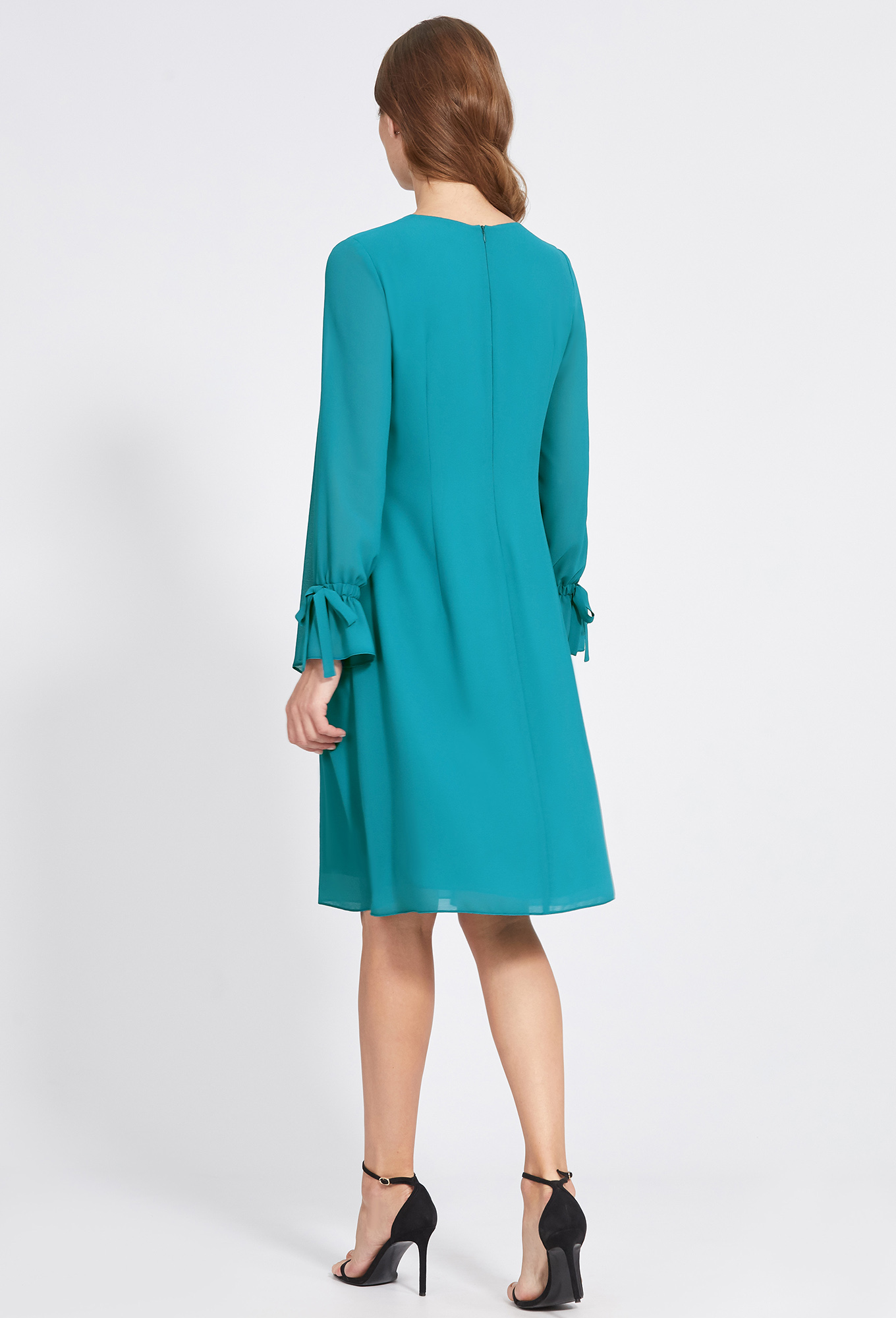 Элегантное платье А-силуэта изготовлено из однотонного шифона, создающего эффект легкости и невесомости. Особое внимание привлекает асимметричный верхний слой с деликатной складкой, который придает модели динамичность и неповторимый стиль. Дизайн дополняют уникальные полупрозрачные рукава длиной до запястья с эластичными манжетами и изящными завязками. Платье дополнено удобной подкладкой из 100% вискозы, обеспечивающей комфорт при носке. Застежка-молния незаметно вшита в средний шов спинки, сохраняя гладкость и целостность силуэта.