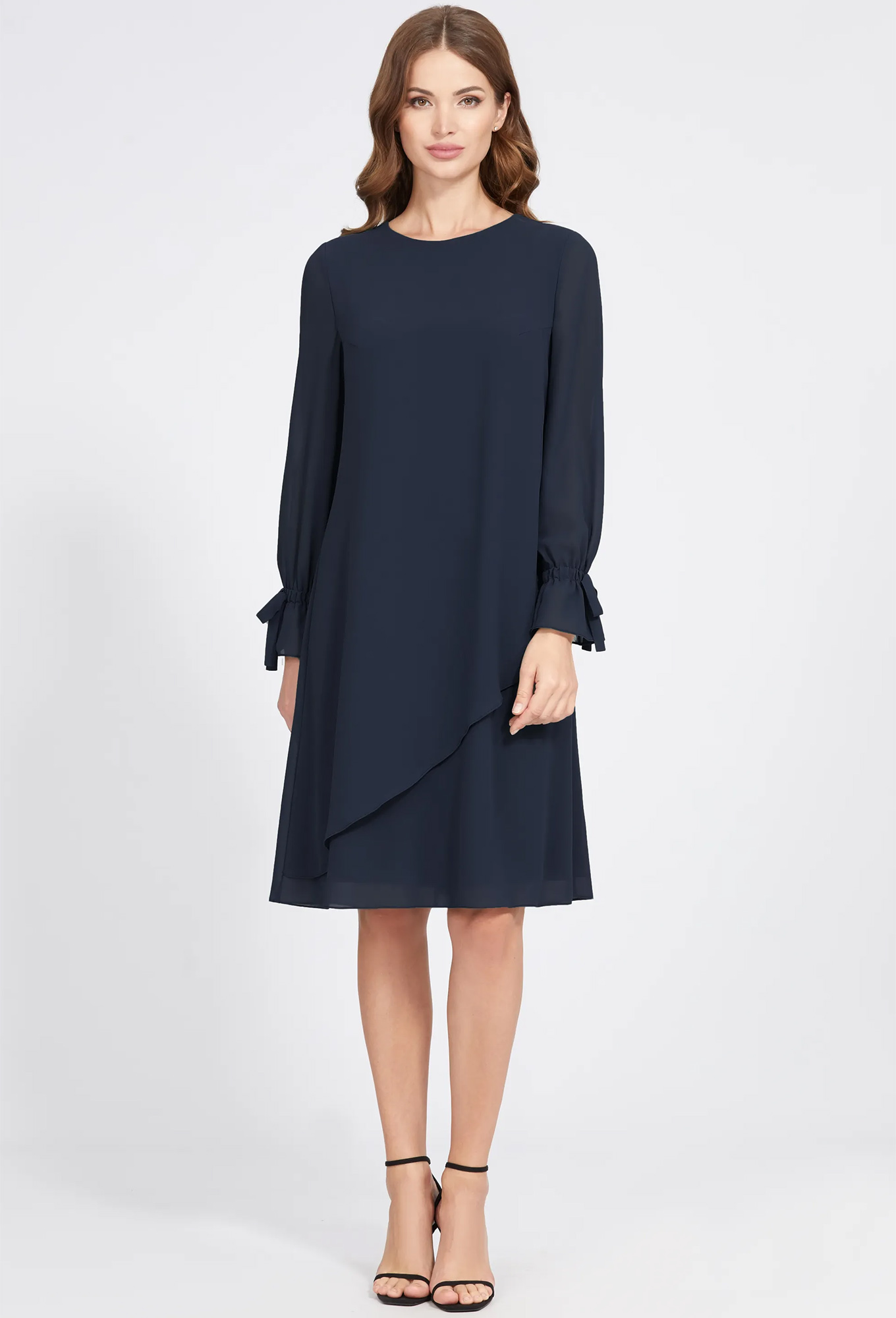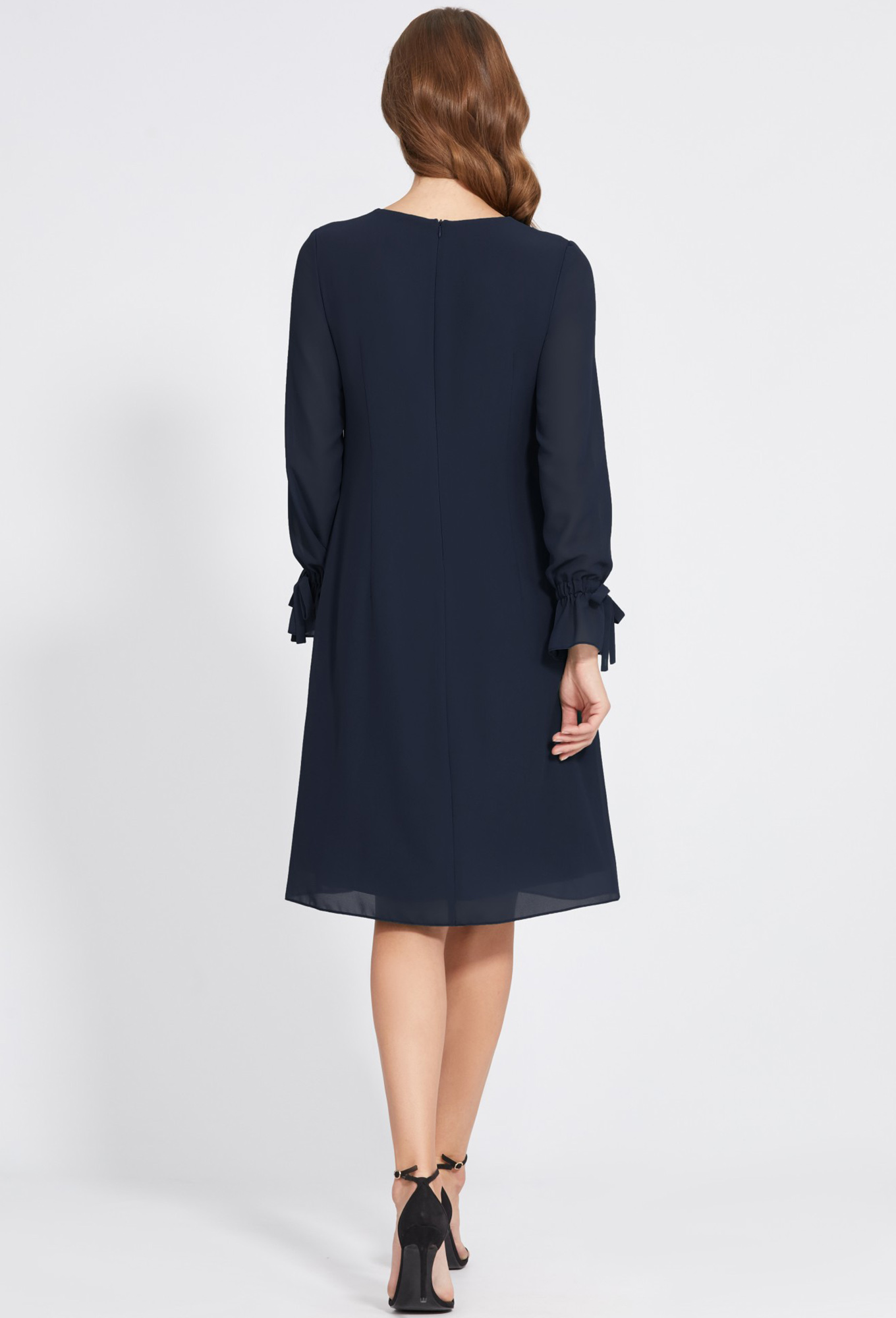 Элегантное платье А-силуэта изготовлено из однотонного шифона, создающего эффект легкости и невесомости. Особое внимание привлекает асимметричный верхний слой с деликатной складкой, который придает модели динамичность и неповторимый стиль. Дизайн дополняют уникальные полупрозрачные рукава длиной до запястья с эластичными манжетами и изящными завязками. Платье дополнено удобной подкладкой из 100% вискозы, обеспечивающей комфорт при носке. Застежка-молния незаметно вшита в средний шов спинки, сохраняя гладкость и целостность силуэта.