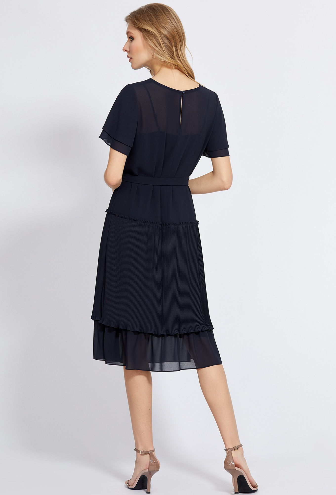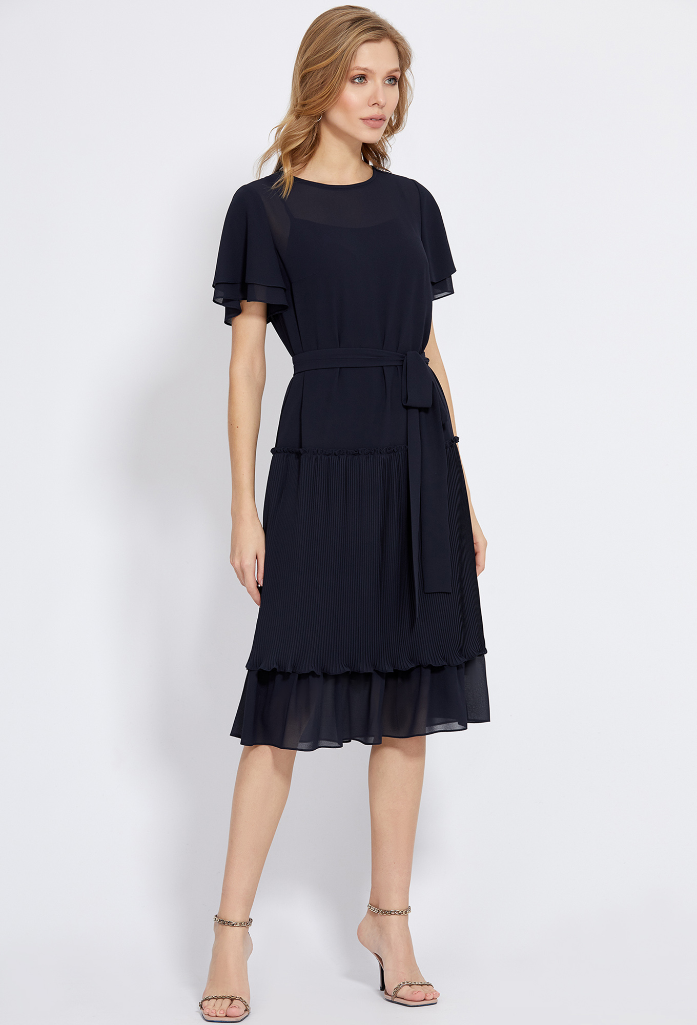 Чрезвычайно нежное платье прямого силуэта, выполненное из мягкого, приятного, однотонного шифона. Привлечь особое внимание к себе помогают оборки, верхняя из которых выполнена с помощью мелкой плиссировки и романтичные двухслойные рукава «флаттер». В среднем шве спинки обработана застёжка на навесную петлю и ювелирную пуговицу. Платье комплектуется с нижним платьем из комфортной 100% вискозной ткани. Для создания приталенного силуэта предусмотрен пояс-завязка, красиво подчёркивающий женскую талию.