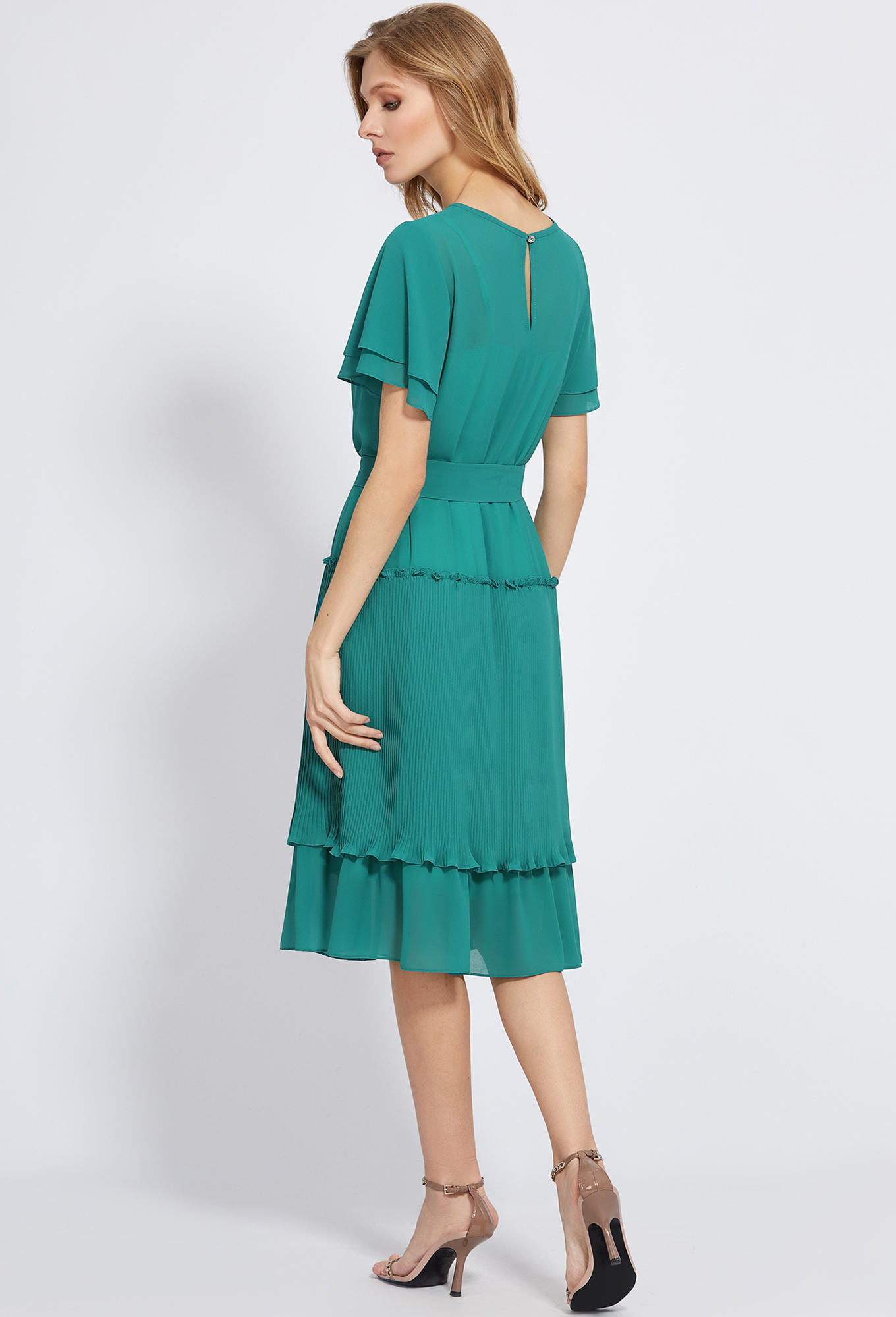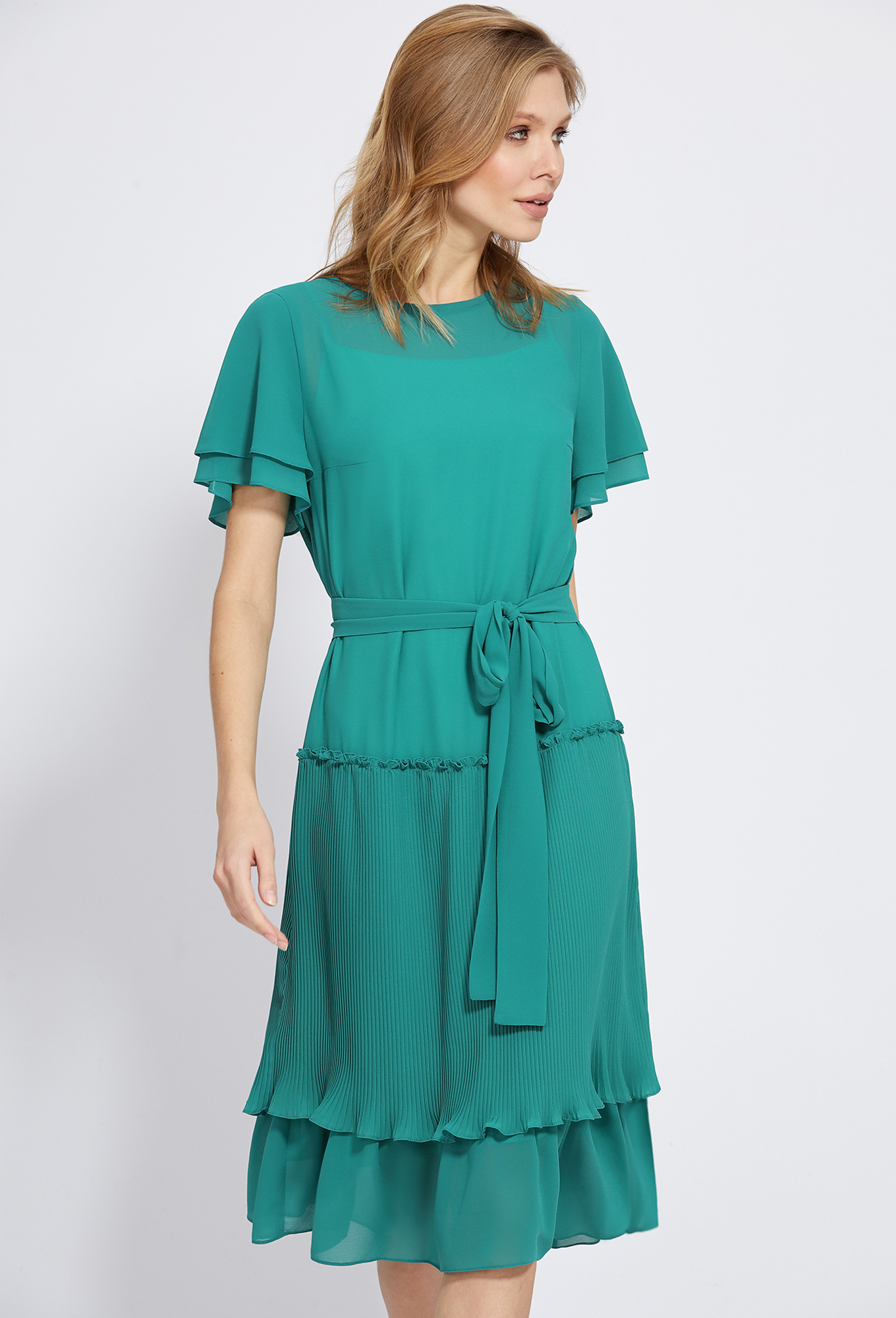 Чрезвычайно нежное платье прямого силуэта, выполненное из мягкого, приятного, однотонного шифона. Привлечь особое внимание к себе помогают оборки, верхняя из которых выполнена с помощью мелкой плиссировки и романтичные двухслойные рукава «флаттер». В среднем шве спинки обработана застёжка на навесную петлю и ювелирную пуговицу. Платье комплектуется с нижним платьем из комфортной 100% вискозной ткани. Для создания приталенного силуэта предусмотрен пояс-завязка, красиво подчёркивающий женскую талию.