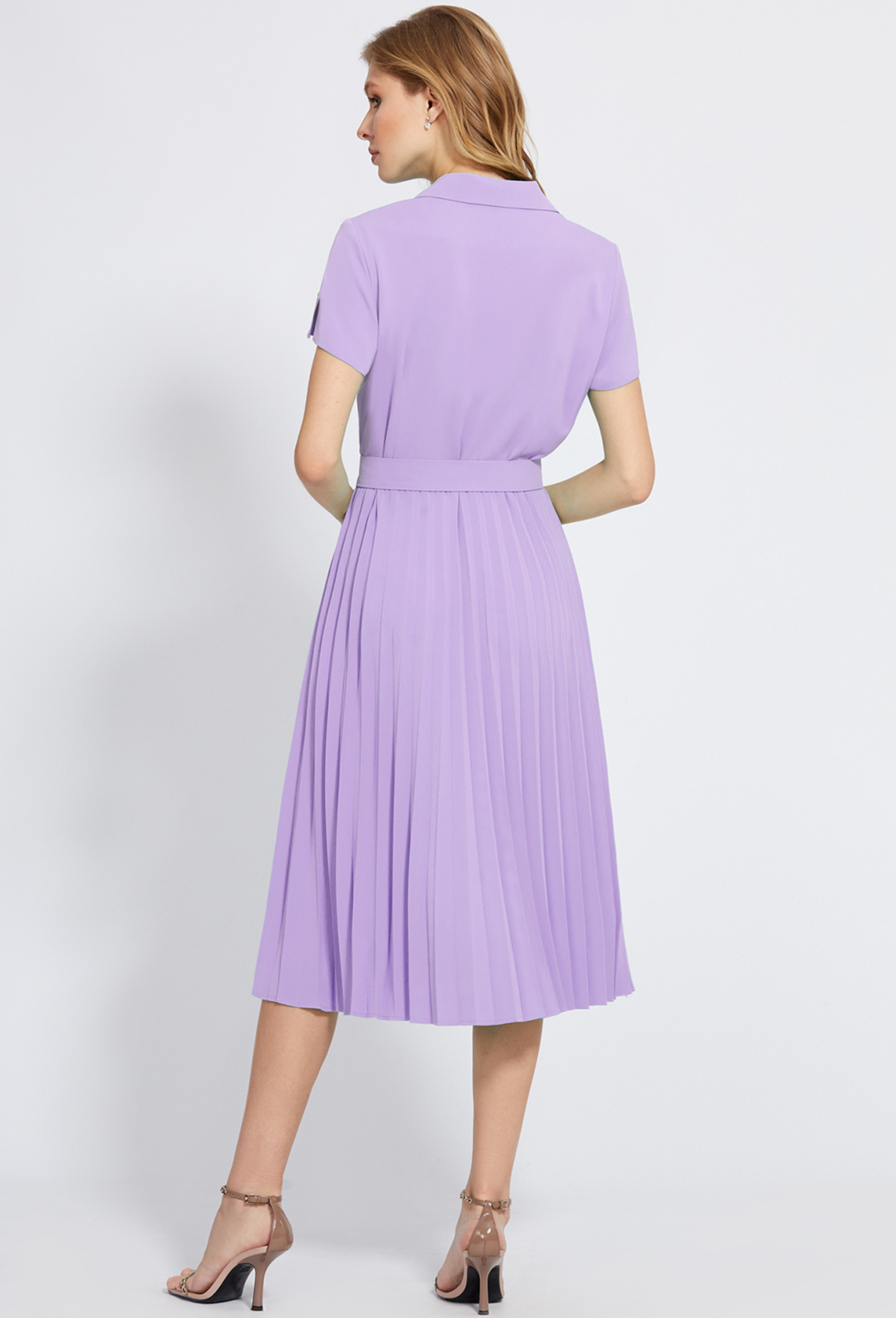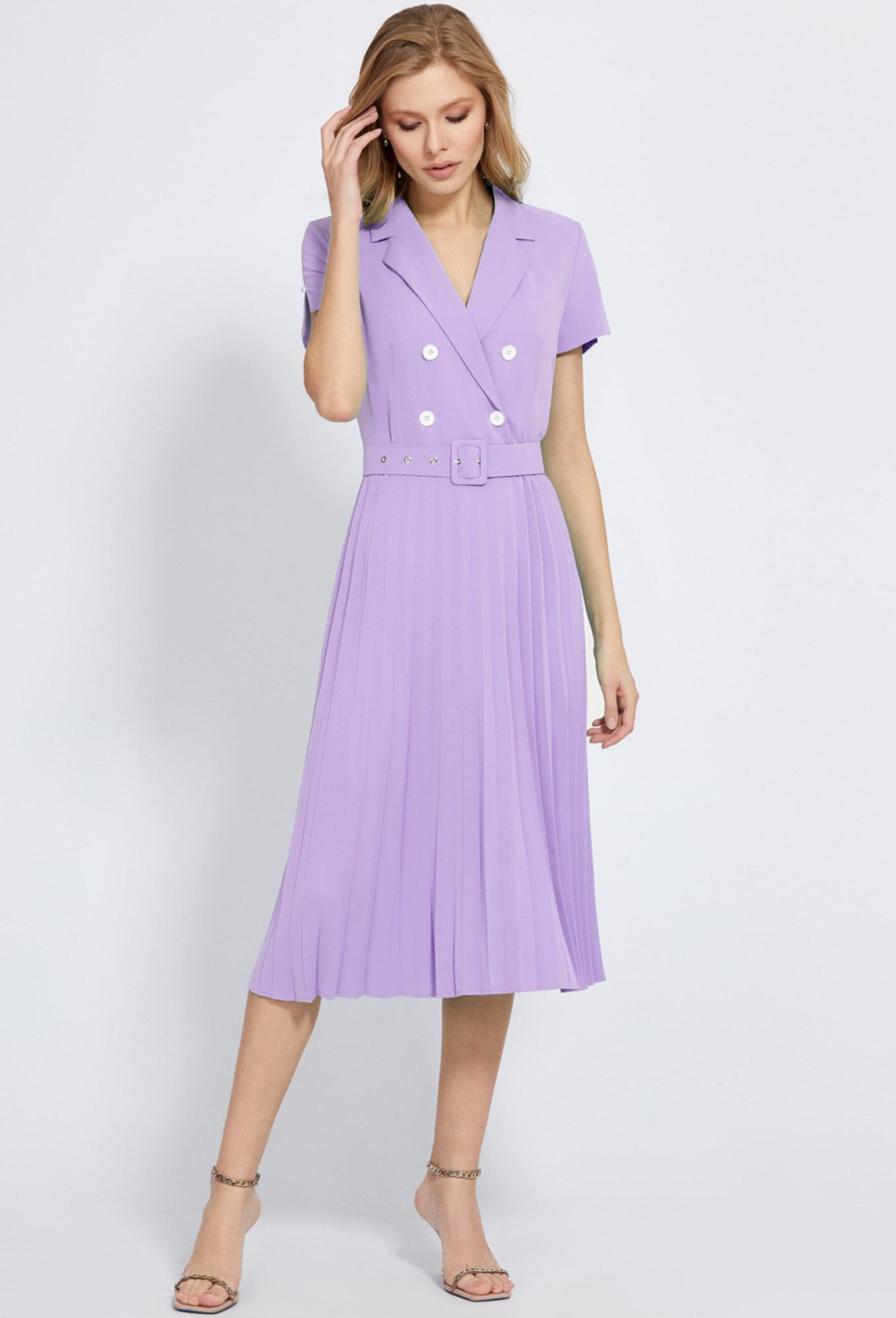 Откройте для себя это уникальное платье, идеально подходящее для особых случаев, которое сшили из приятной немнущейся ткани нежного оттенка. Лиф модели с отложным воротником с лацканами, с V-образным вырезом горловины и с имитацией двубортной застёжки с пуговицами. Рукава короткие втачные, с разрезами и украшены бусинами. Эффектность модели также придаёт плиссированная юбка, добавляя изящности при движении. Для удобства при носке, в левом боковом шве обработана застёжка на потайную молнию. Завершить образ помогает пояс с пряжкой в тон, выгодно подчёркивающий талию.