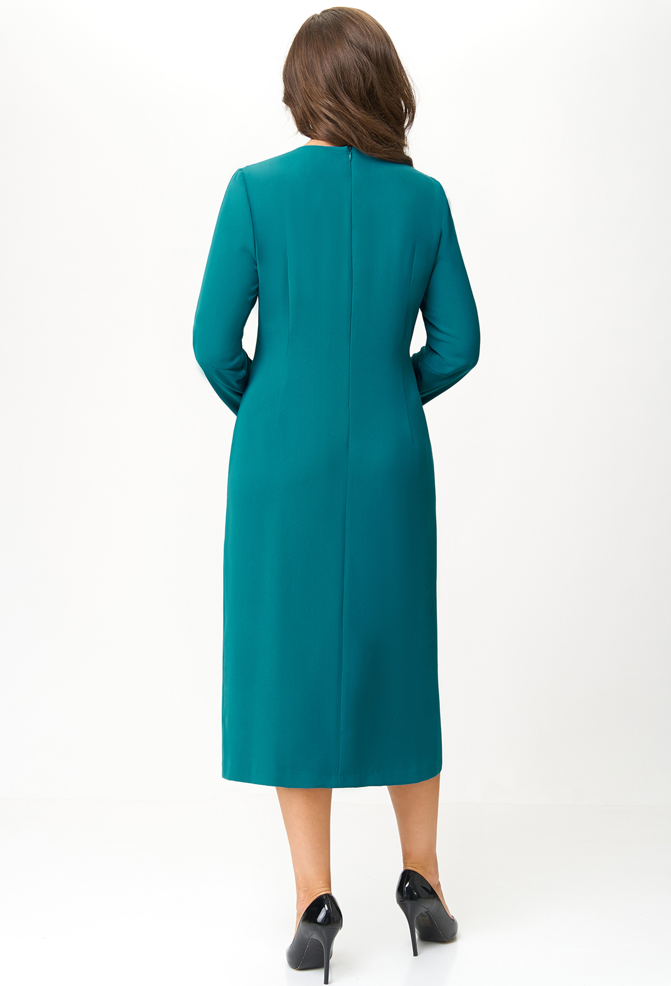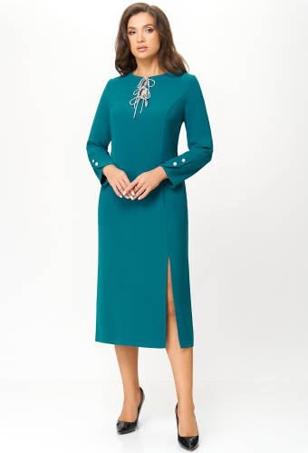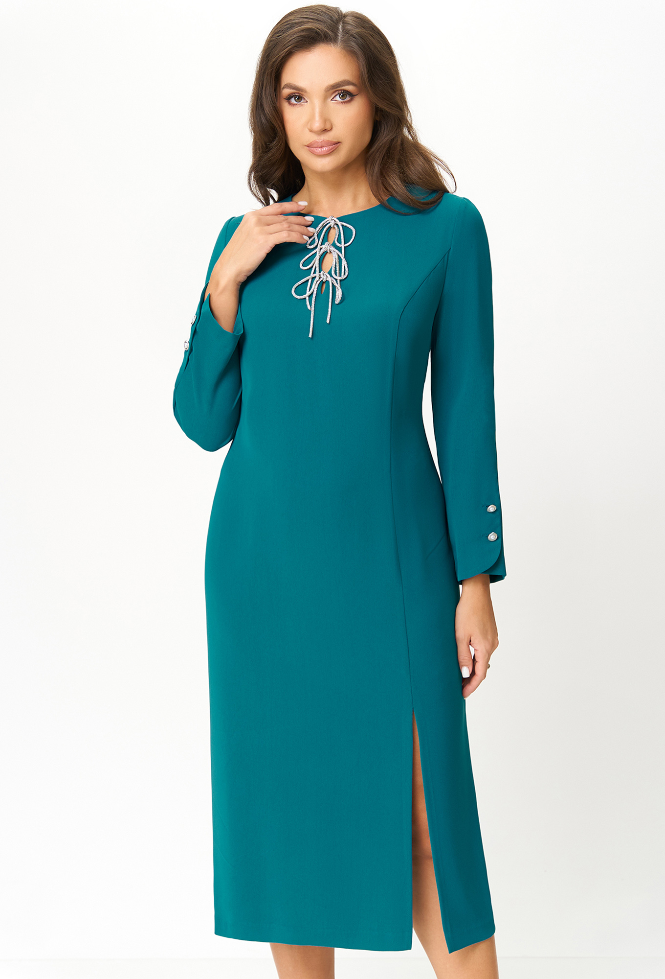 Это платье миди с его восхитительной элегантностью идеально подходит для официальных случаев. Блестящие банты из хрустальной тесьмы привлекают внимание, создавая изысканный контраст с матовой однотонной тканью, сдержанно скрывая глубокий фигурный вырез. Модель дополнена разрезом по переду, придающим лёгкость движению и подчёркивающим Вашу женственность, а также оригинальными рукавами с красивыми пуговицами-жемчужинами. В среднем шве спинки обработана застёжка на потайную молнию.