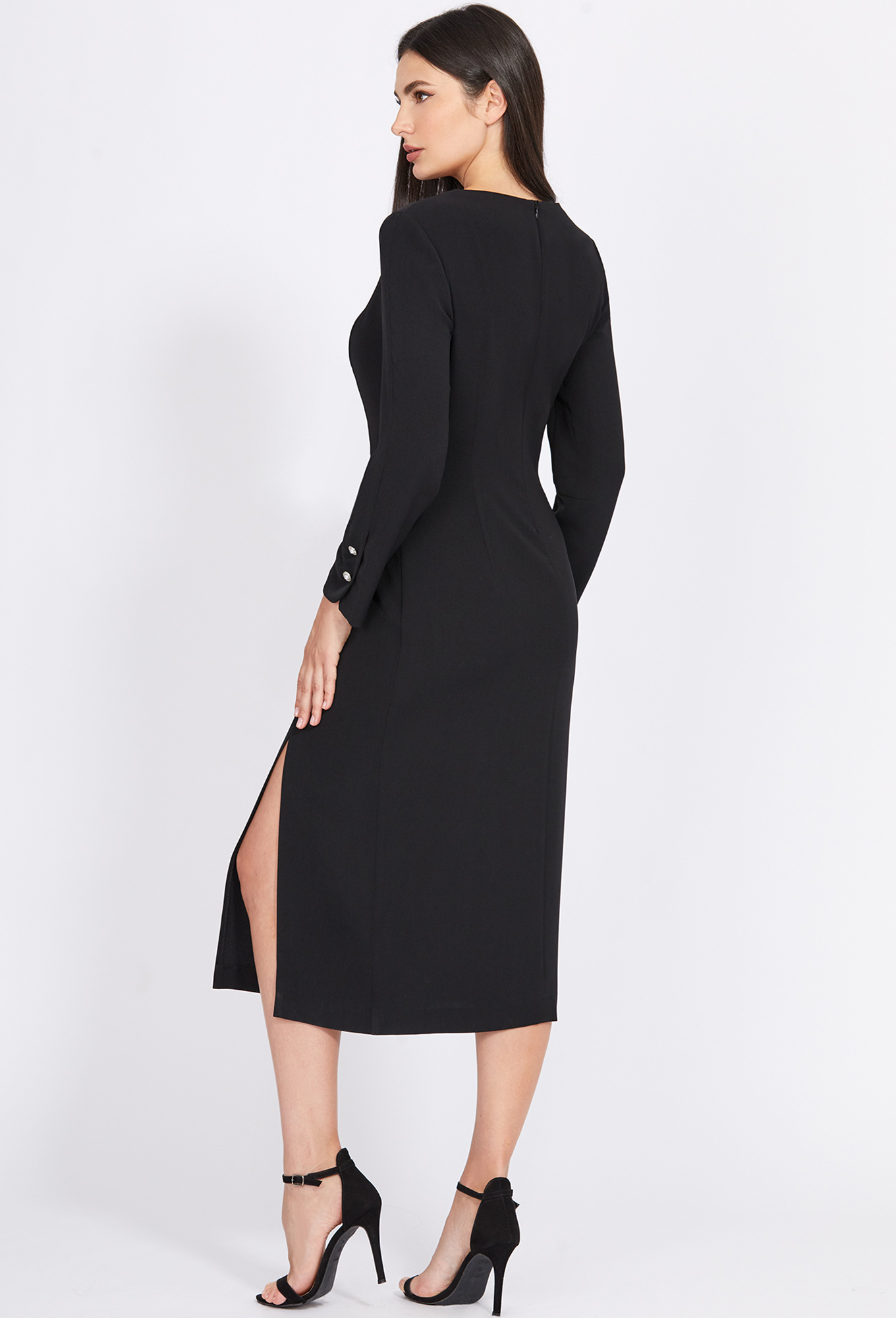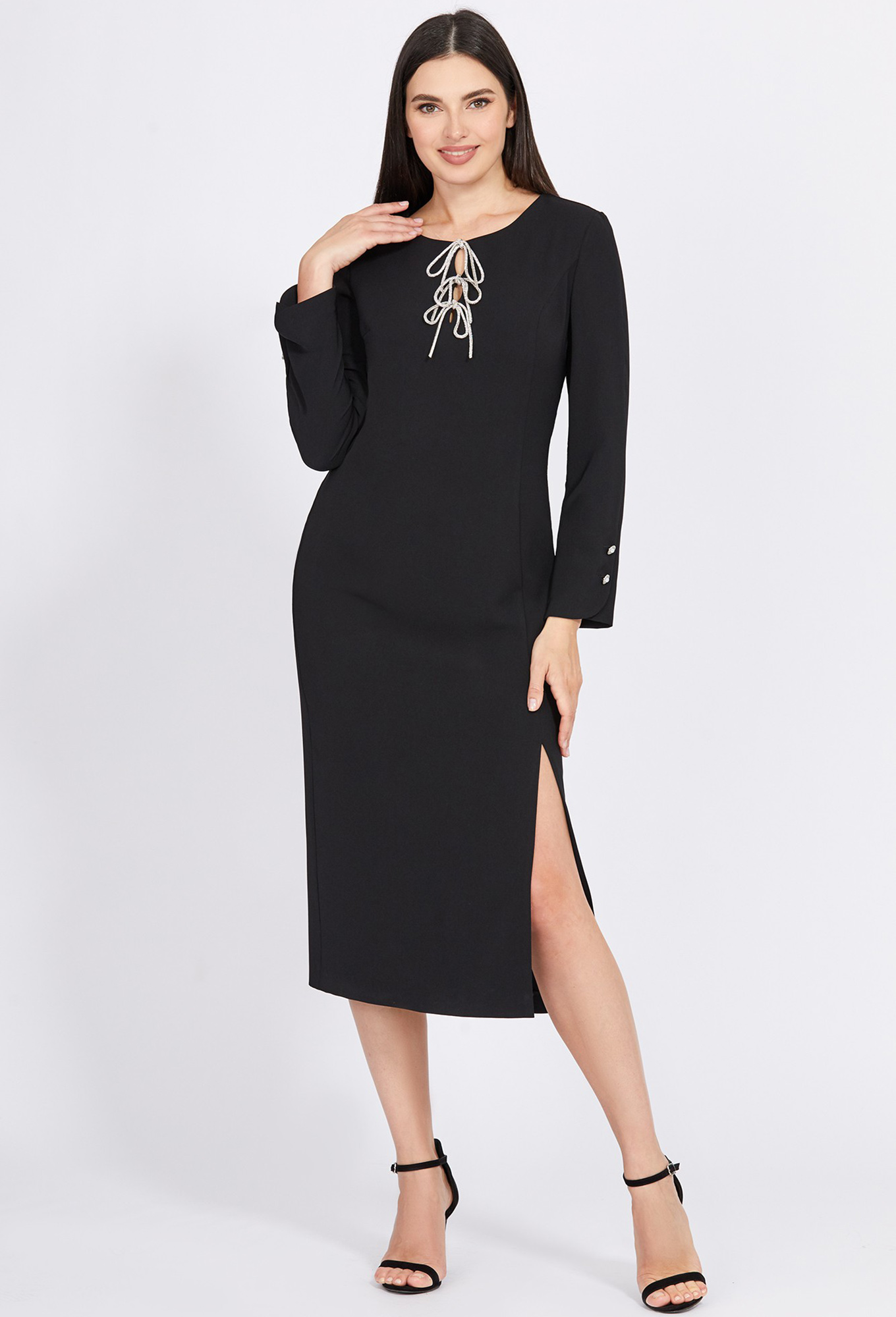 Это платье миди с его восхитительной элегантностью идеально подходит для официальных случаев. Блестящие банты из хрустальной тесьмы привлекают внимание, создавая изысканный контраст с матовой однотонной тканью, сдержанно скрывая глубокий фигурный вырез. Модель дополнена разрезом по переду, придающим лёгкость движению и подчёркивающим Вашу женственность, а также оригинальными рукавами с красивыми пуговицами-жемчужинами. В среднем шве спинки обработана застёжка на потайную молнию.