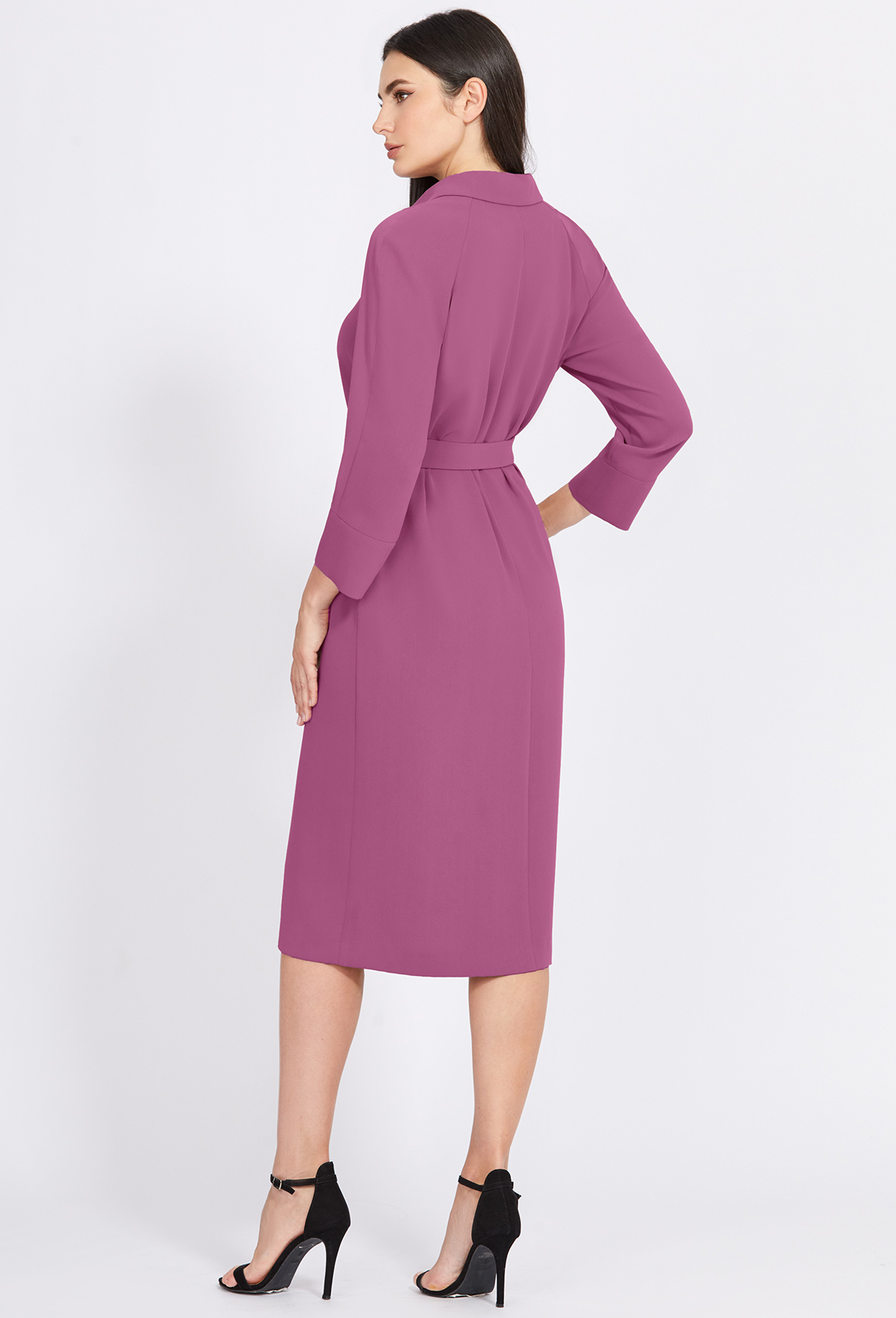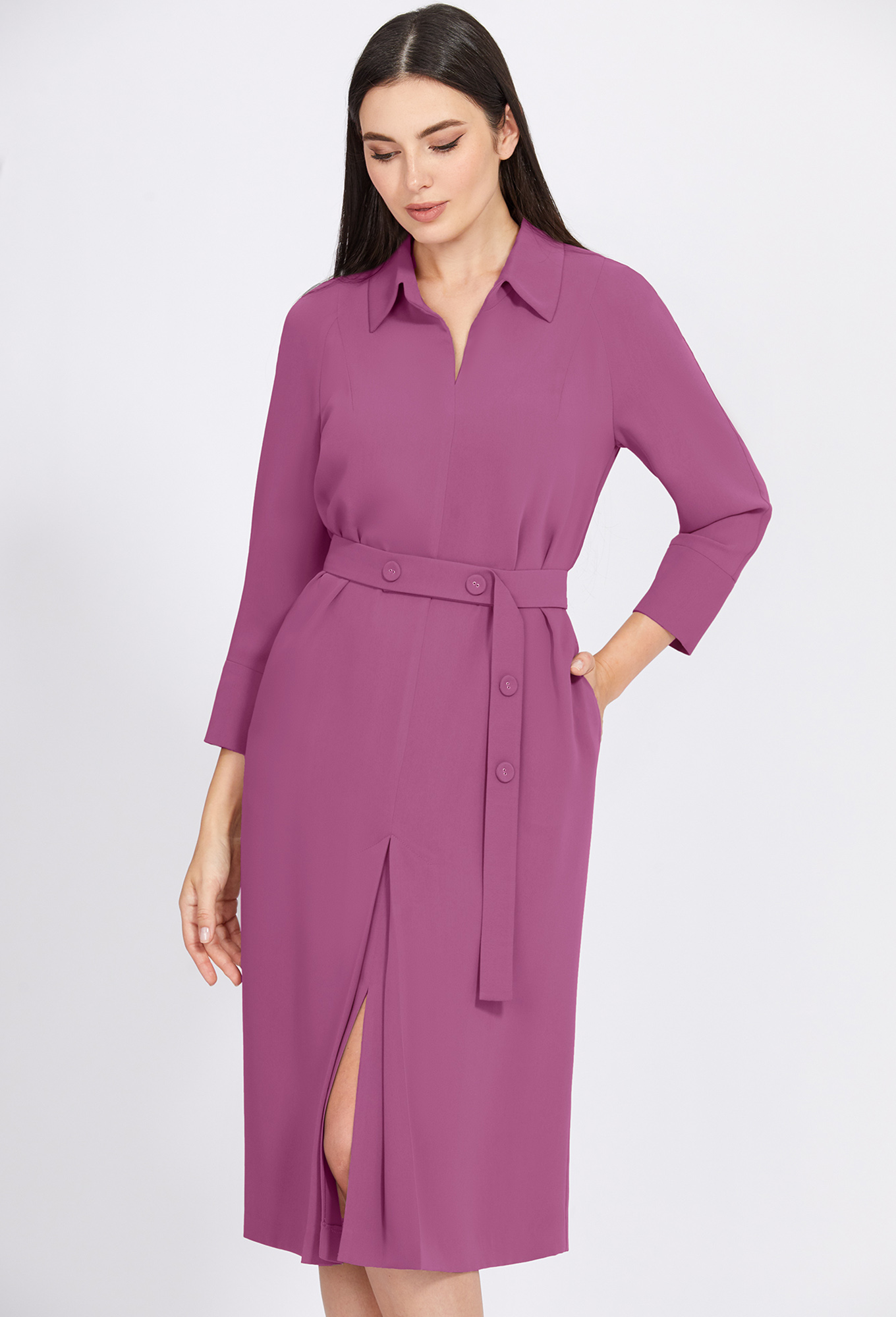 Эффектные платье-миди прямого силуэта, с интересными элементами кроя, выручит во многих ситуациях, будь-то офис, светское мероприятие или ужин в ресторане. Модель с укороченными рукавами-реглан с притачными манжетами, с отложным воротником с цельнокроеной стойкой,с V-образным вырезом горловины, разрезом-складкой в среднем шве переда и функциональными карманами в боковых швах, выполнили из мягкой, приятной, однотонной ткани. Линия талии красиво подчёркивается поясом с отделочными пуговицами в тон.