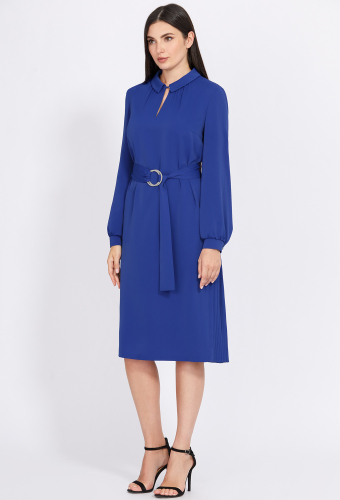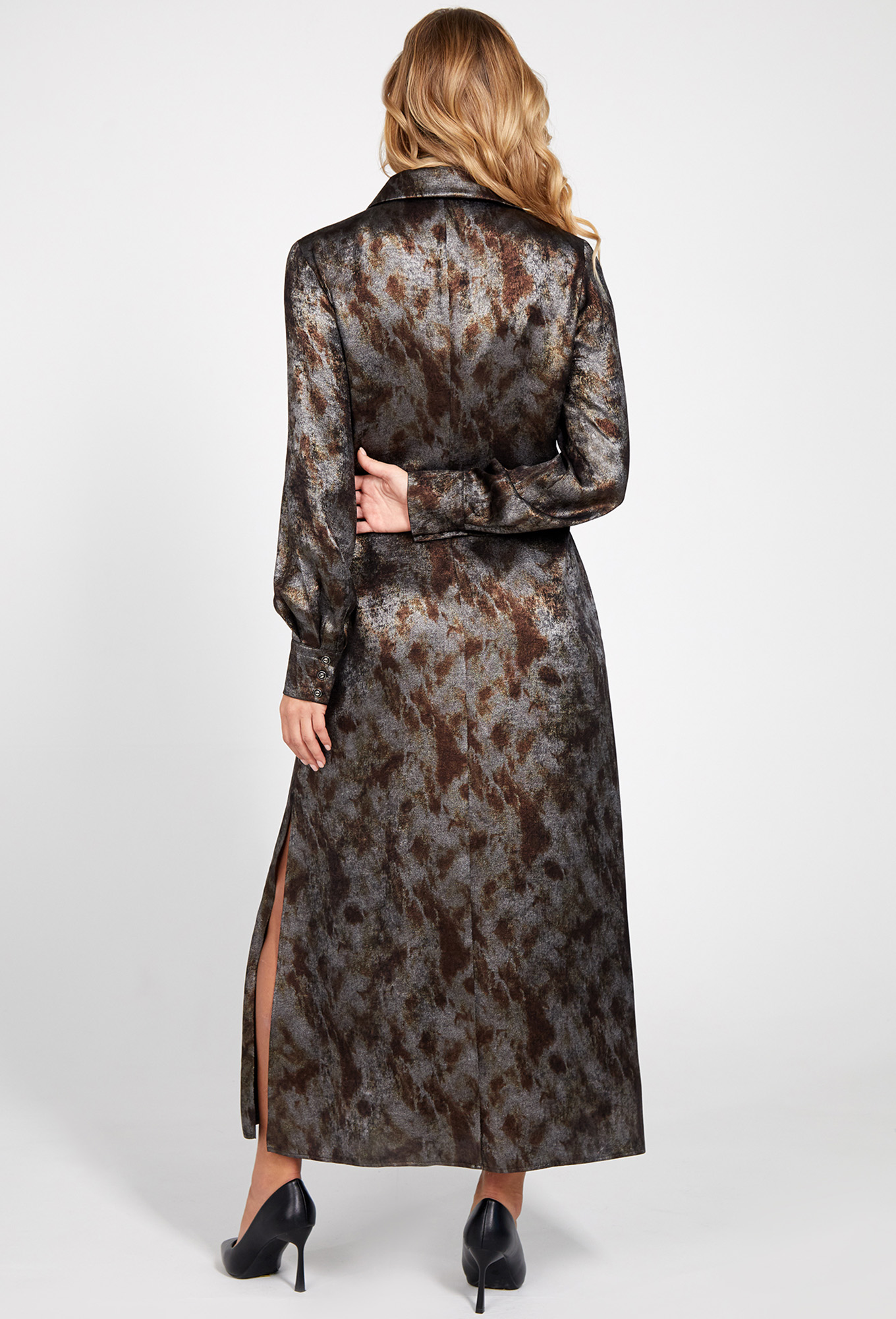 Платье-рубашка расклешенного кроя будет уместно для создания различных образов. Модель длины мидакси выполнили из приятной струящейся ткани с мерцающим абстрактным дизайном, красиво переливающимся при движении. Рубашечный воротник придаёт образу грациозности, а застёжка на пуговицы по всей длине позволяет регулировать глубину выреза декольте. Интересный крой с деталями-завязками по переду, длинные рукава с широкими манжетами и разрезы в боковых швах - делают платье летящим и стильным. Ослепительный образ не требует дополнительных украшений и аксессуаров, поэтому, чтобы его не перегрузить, можно выбрать минималистичные украшения, неброские миниатюрные сумки или клатч.