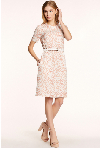 Платье прямого силуэта из шифона в мелкий горошек с овальным вырезом горловины и сборкой по низу