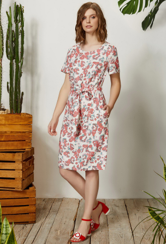 Романтическое платье А-образного силуэта из принтованого шифона в мелкий цветочек и горошек, отрезное по талии и собранное на резинку, с округлой формой горловины, с оборками по низу, горловина переда с оборками в виде имитации воротника с завязкой, по спинке обработана застежка на навесную петлю и пуговицу, рукава-фонарики. Дополняется поясом-ремнем с пряжкой.