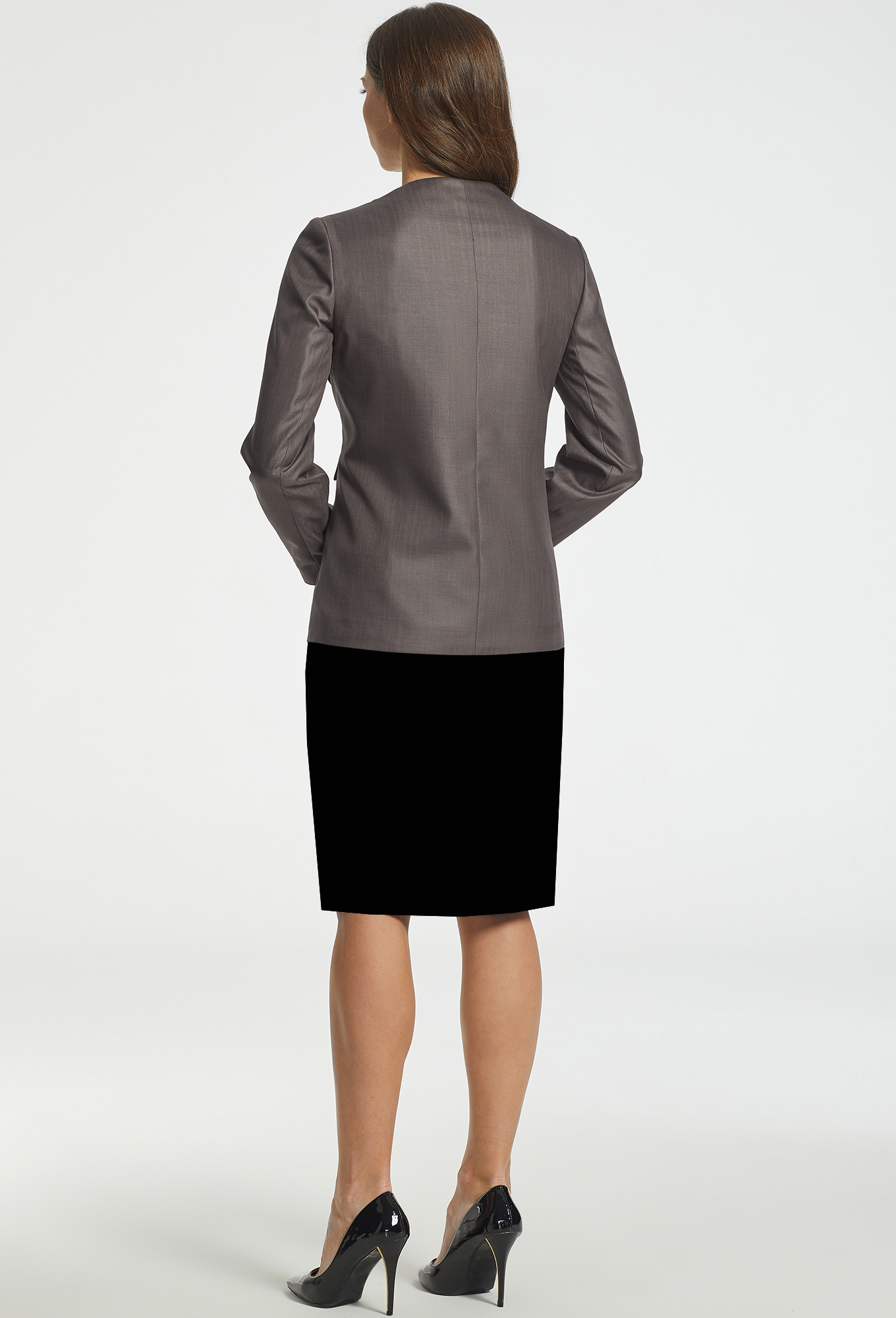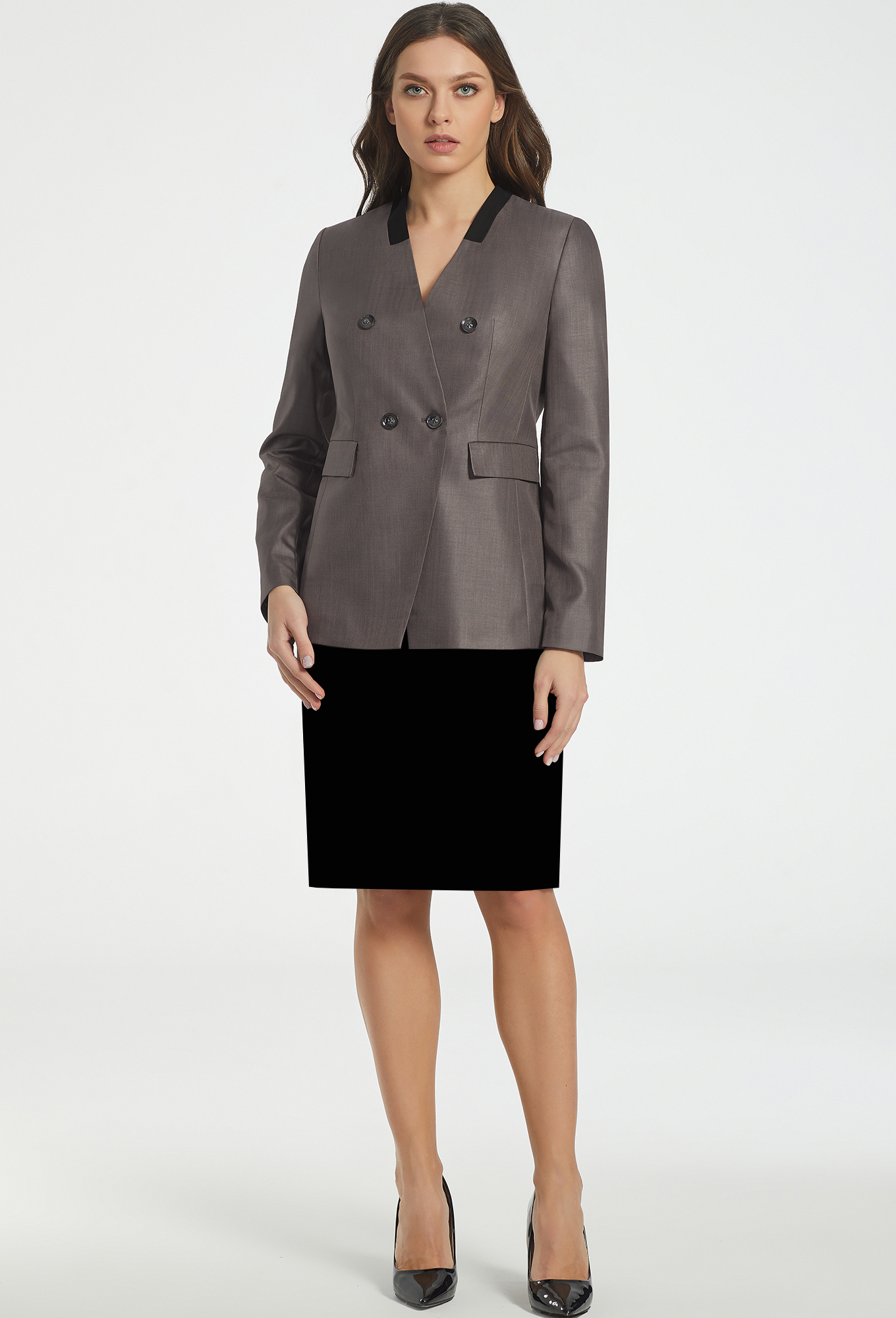 Комфортный двубортный жакет с застежкой на петли и пуговицы. Перед с V-образным вырезом горловины и фигурной формой борта, двумя горизонтальными карманами с клапанами и контрастной деталью в области горловины. Рукава втачные двушовные с контрастными нижними частями, на подкладке.