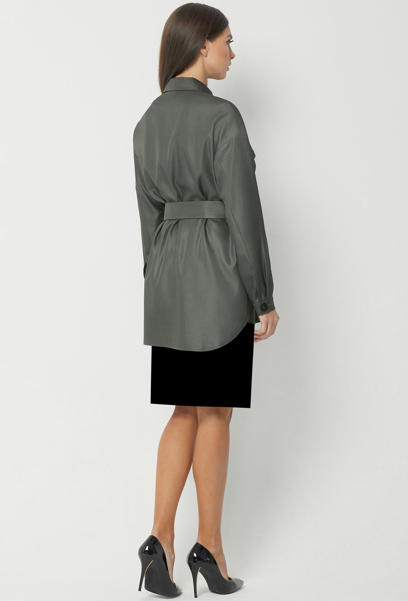 Жакет свободного кроя, со спущенной линией плеча и разным уровнем низа переда и спинки. Перед с центральной застежкой на петли и пуговицы и двумя накладными карманами с клапанами и декоративными пуговицами. Рукава рубашечного типа с манжетами и застёжкой на петли-пуговицы. Воротник отложной с отрезной стойкой. Дополняется поясом с пряжкой из основной ткани.